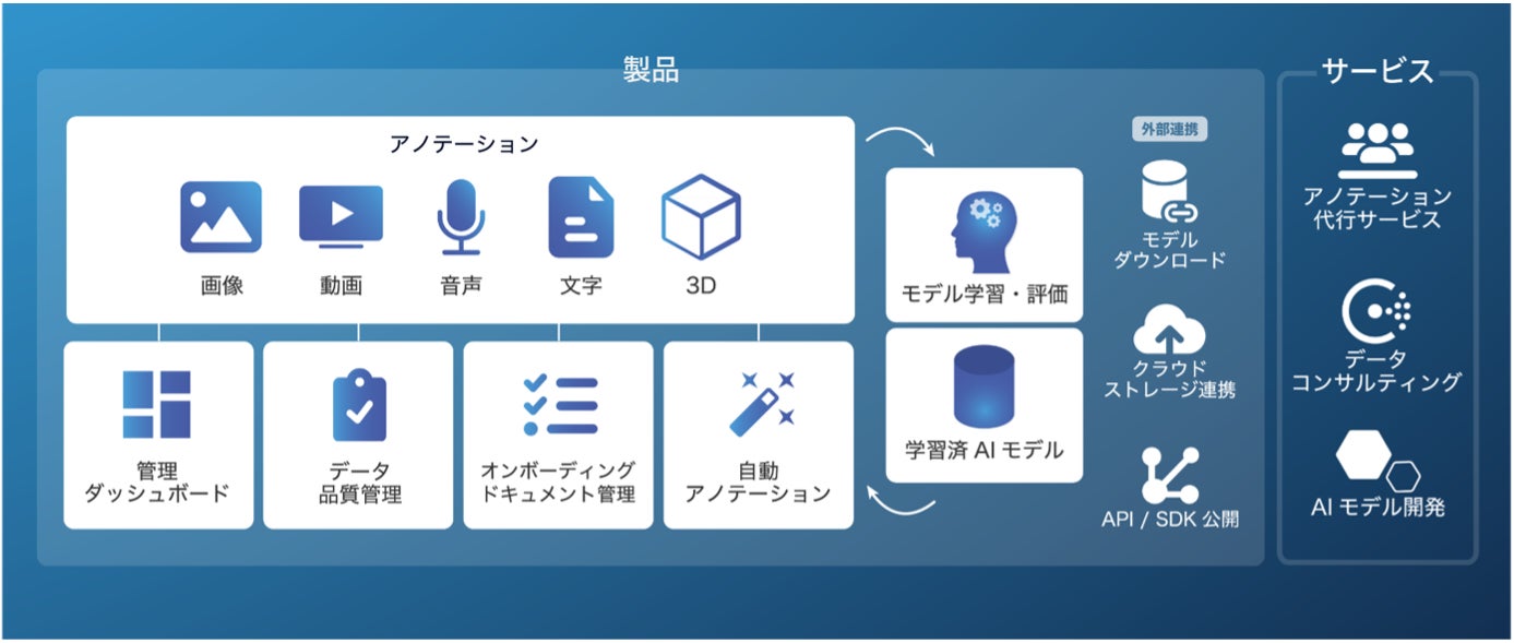 FastLabelは、アノテーションツール、教師データ作成代行、MLOps構築を包括したAIデータプラットフォーム『FastLabel』を開発・提供しています。教師データの作成と改善を高速かつ正確に行うためのアノテーションツールと、高度人材によるきめ細かいアノテーションサービスにより、高品質な教師データを素早く提供できることが特徴です。