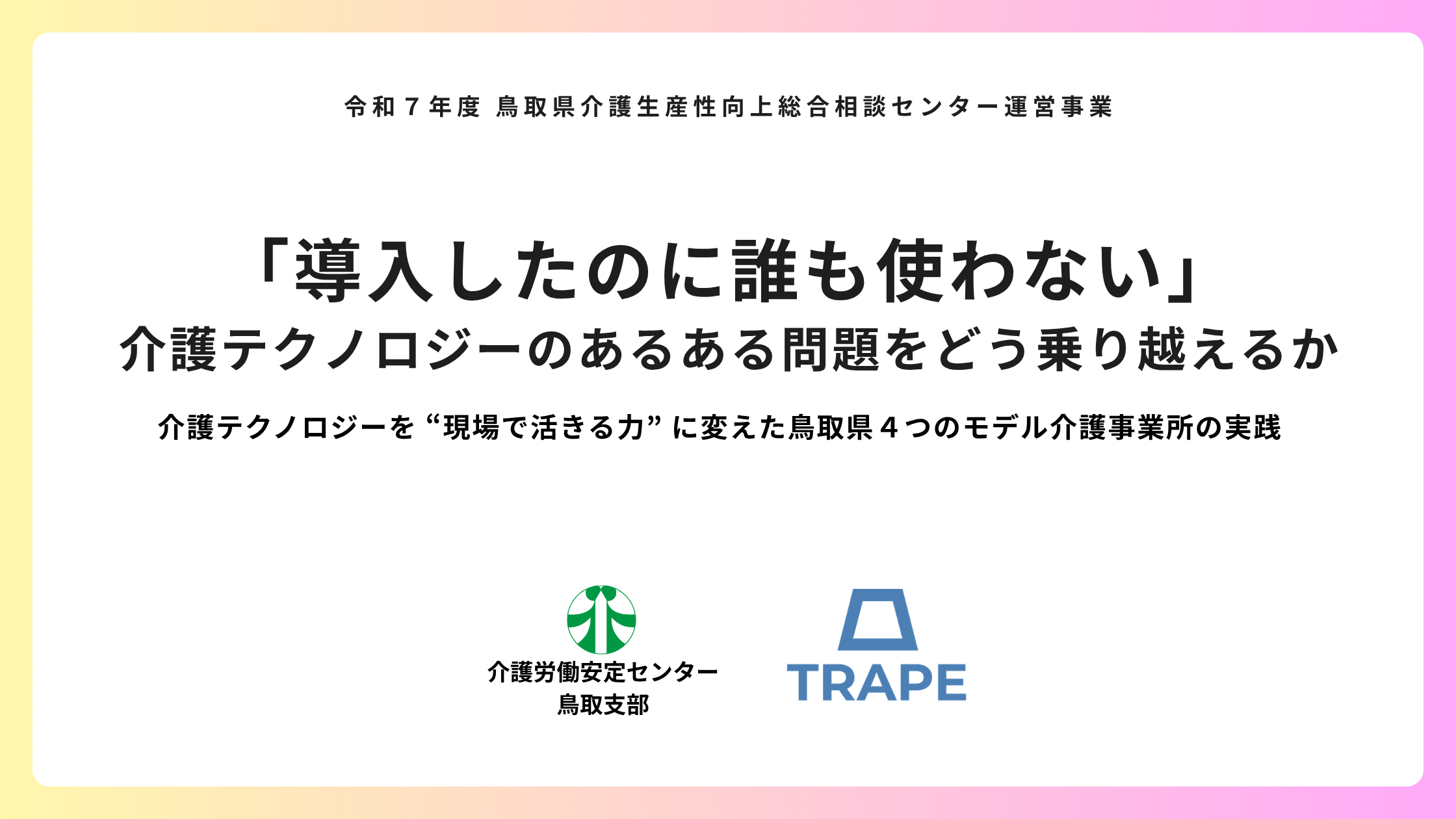 介護現場の生産性向上に関するガイドラインの作成など、2017年から国の施策づくりに関わり介護分野の変革をリードしてきた株式会社TRAPE(本社:大阪府大阪市、代表取締役社長:鎌田大啓)は、ウェルビーイングにあふれた介護事業所の実現を目指し、現場の業務改善やDXに不可欠な「チームづくり」や「課題の見える化・分析」を支援する無料のオンラインツール「生産性向上くん®」の提供と、「生産性向上」「働きがい向上」「リーダー育成」を同時に実現する伴走支援サービス「Sociwell(ソシウェル)」を展開する中で、令和7年度 鳥取県介護生産性向上総合相談センター様(公益財団法人介護労働安定センター鳥取支部様が鳥取県より受託)の業務アドバイザーを受託し、鳥取県内で生産性向上の取組みを行う4つのモデル介護事業所に対して伴走支援を実施しました。