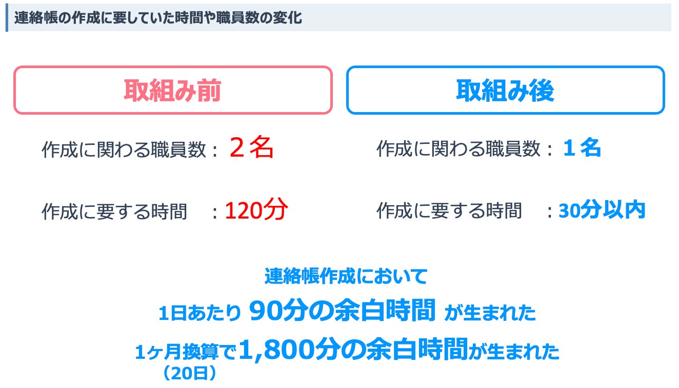成果:連絡帳の作成にかかる時間は1ヶ月換算で1,800分の余白時間が生まれ、散歩などのレクを再開した