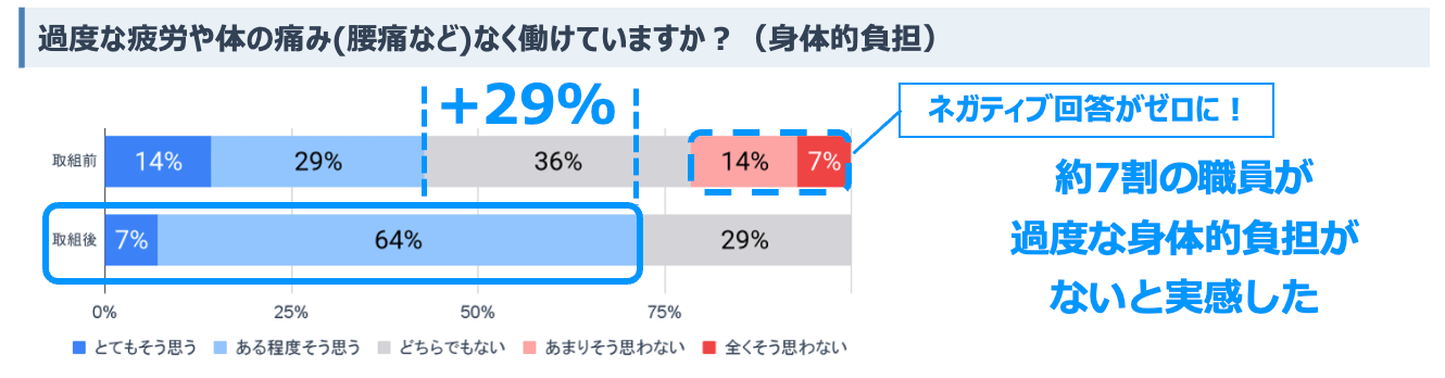 成果:全職員が休憩を取れるようになり、身体的な負担なく働けるようになった