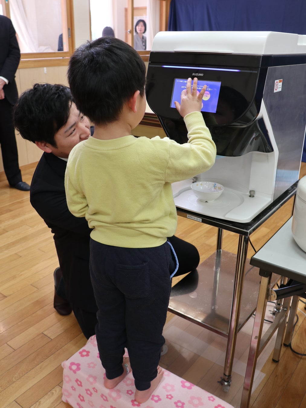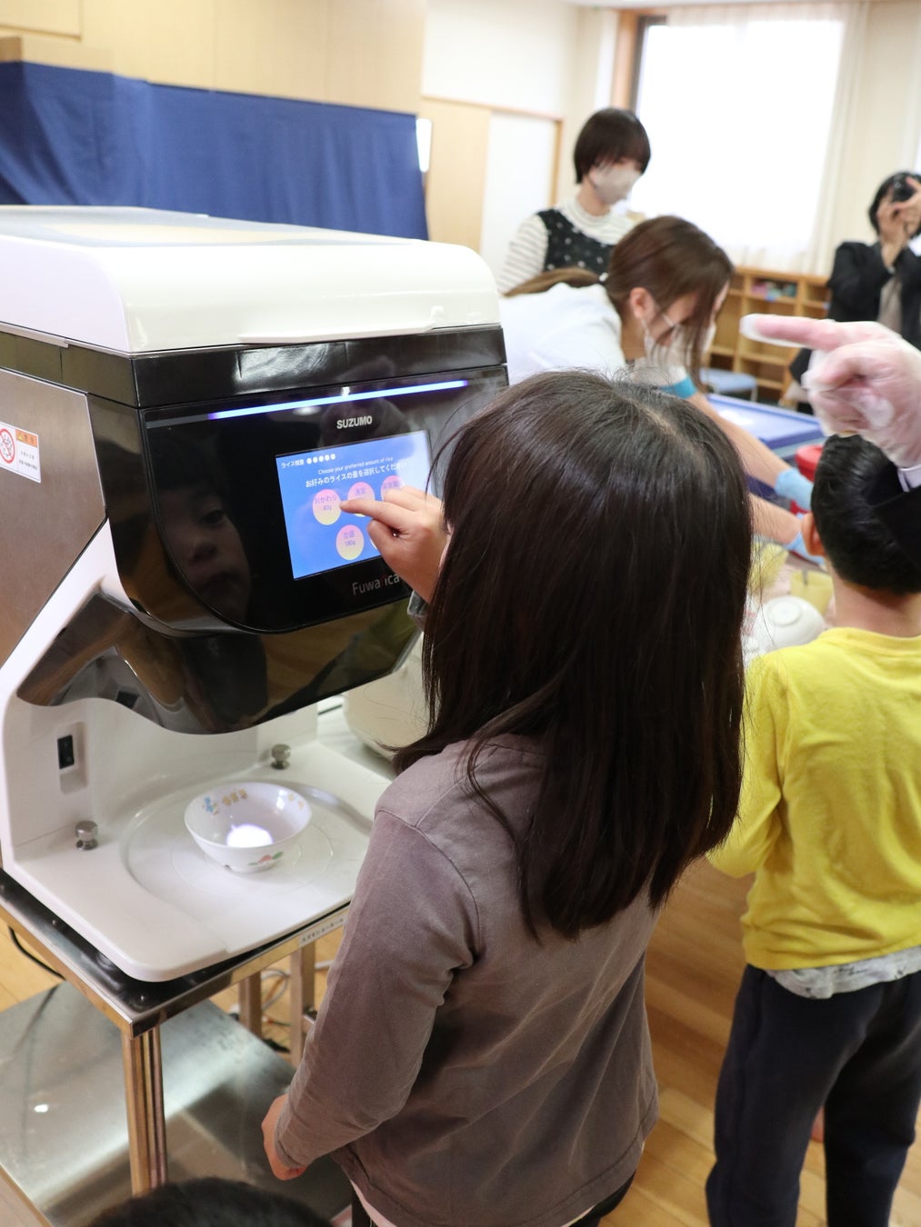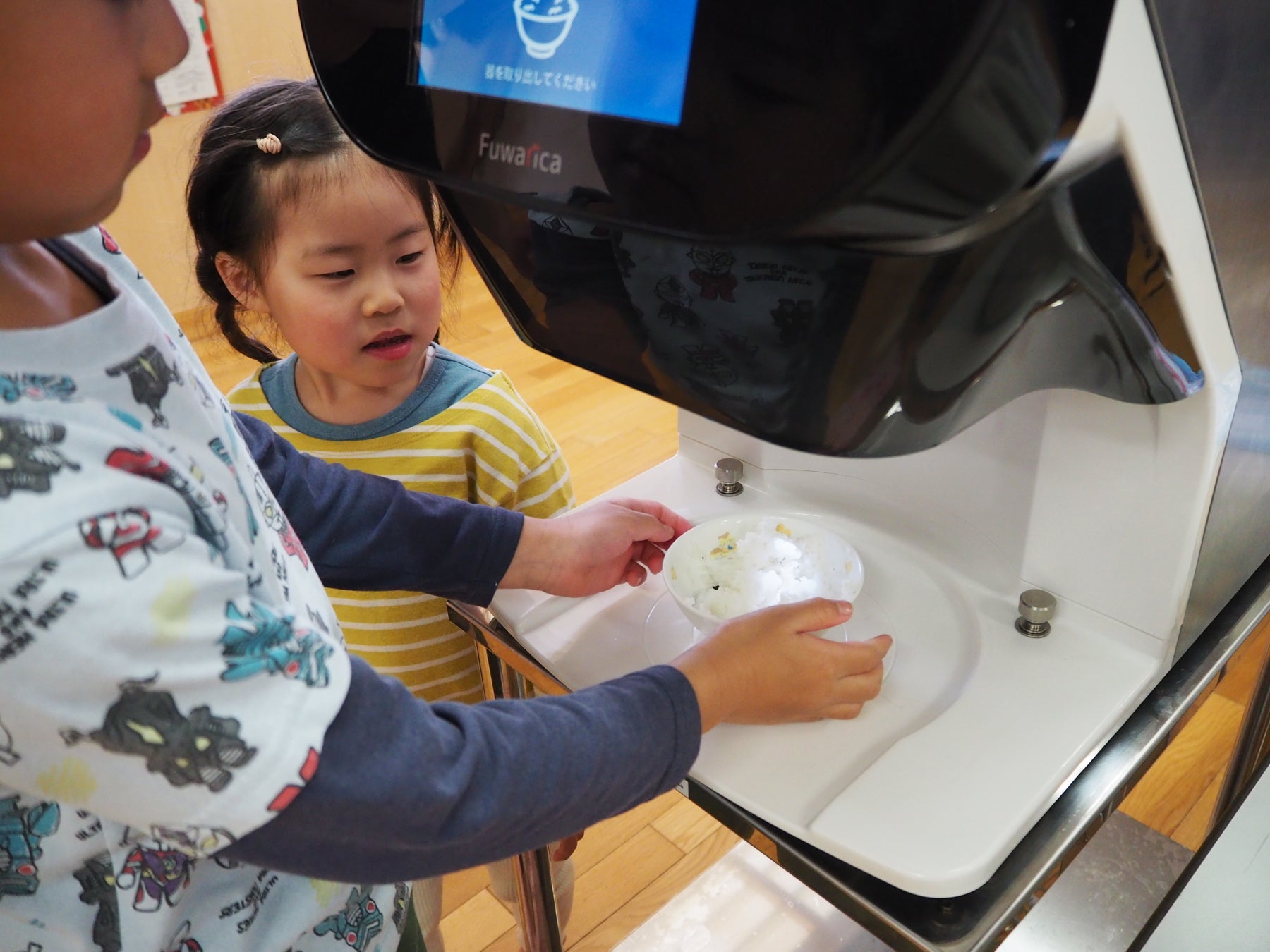 この日は、おかわり希望の子ども達には発表会会場に設置されたFuwaricaを使って自分でおかわりを体験してもらいました。ボタン一つでパラパラと盛付けられるご飯を見て、驚きの声もあがりました。おかわりをしているお友達を見て、「僕も(わたしも)おかわりしたい!」とおかわり体験も大盛況でした。