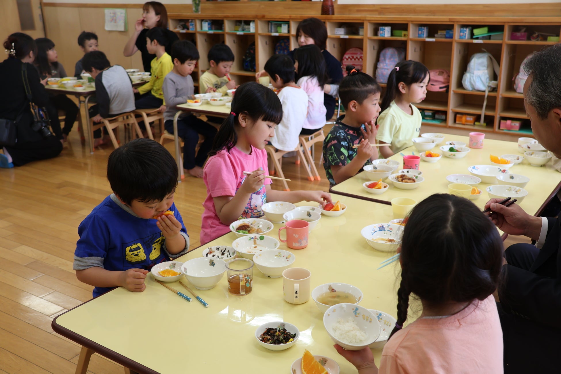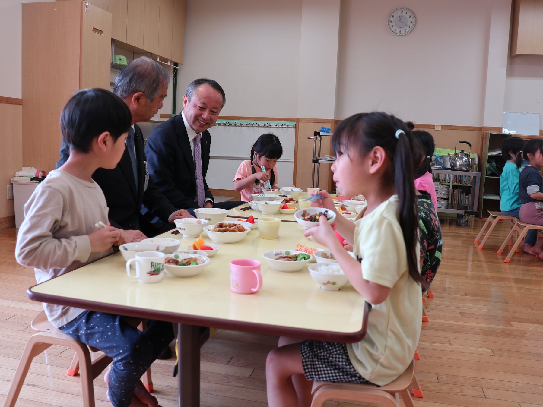 5歳児クラスの給食の時間に、齊藤市長、谷口副社長が同席し実際の子ども達との給食を体験。