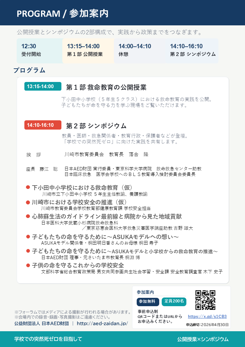 フォーラム第1部では、教諭による救命教育(心肺蘇生やAEDの活用)の公開授業を行い、第2部では医師等医療・救急関係者、学校や教育委員会、文部科学省等教育関係者、保護者などによるシンポジウムを通して、「学校での突然死ゼロ」を目指す取り組みを探求します。
