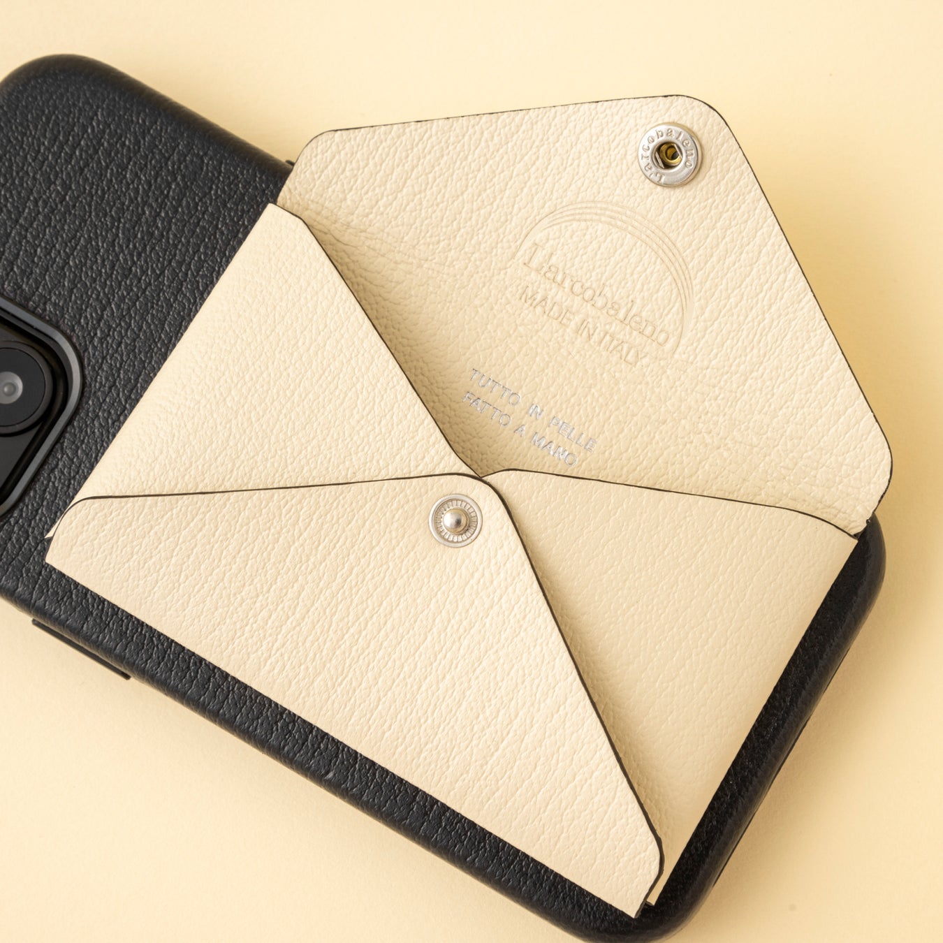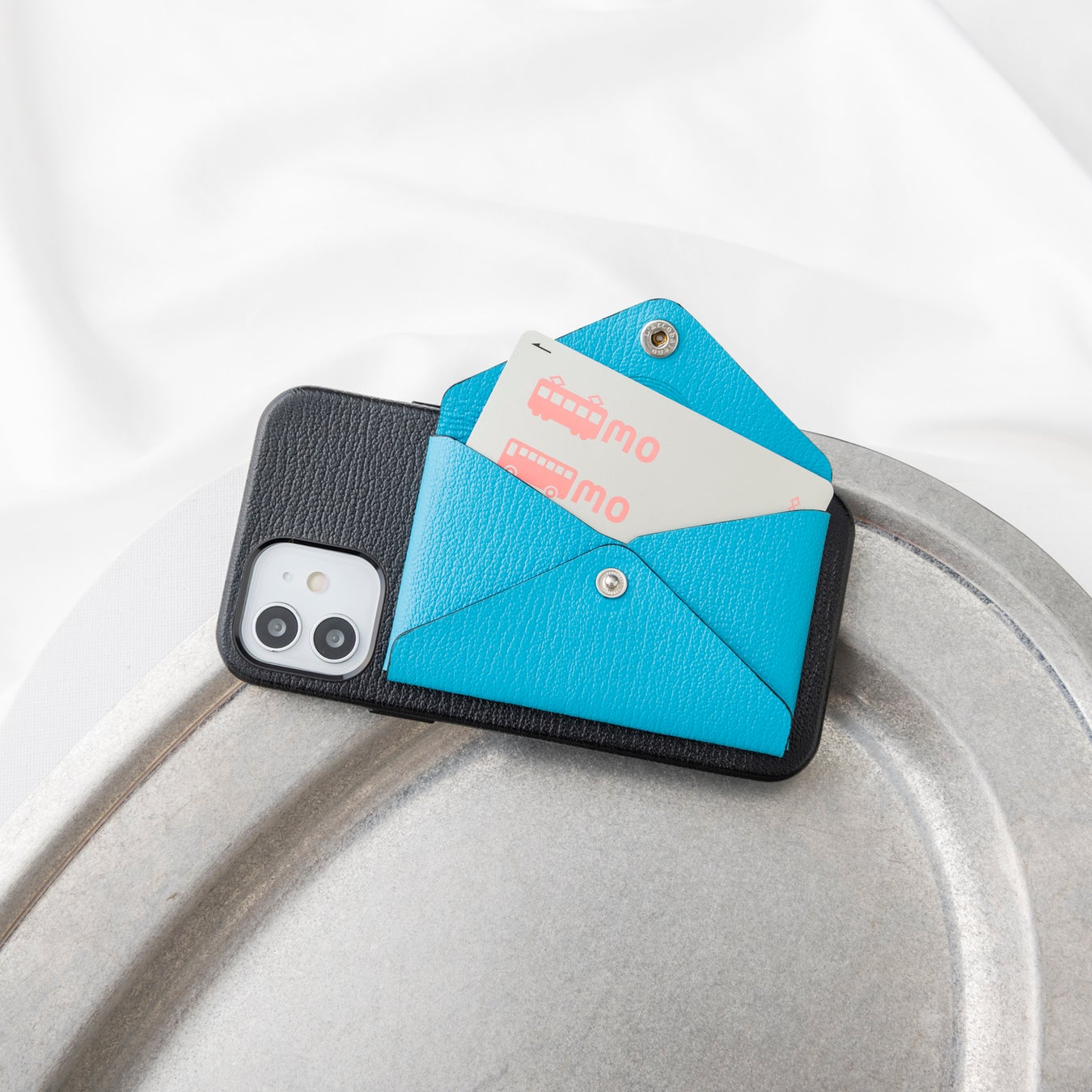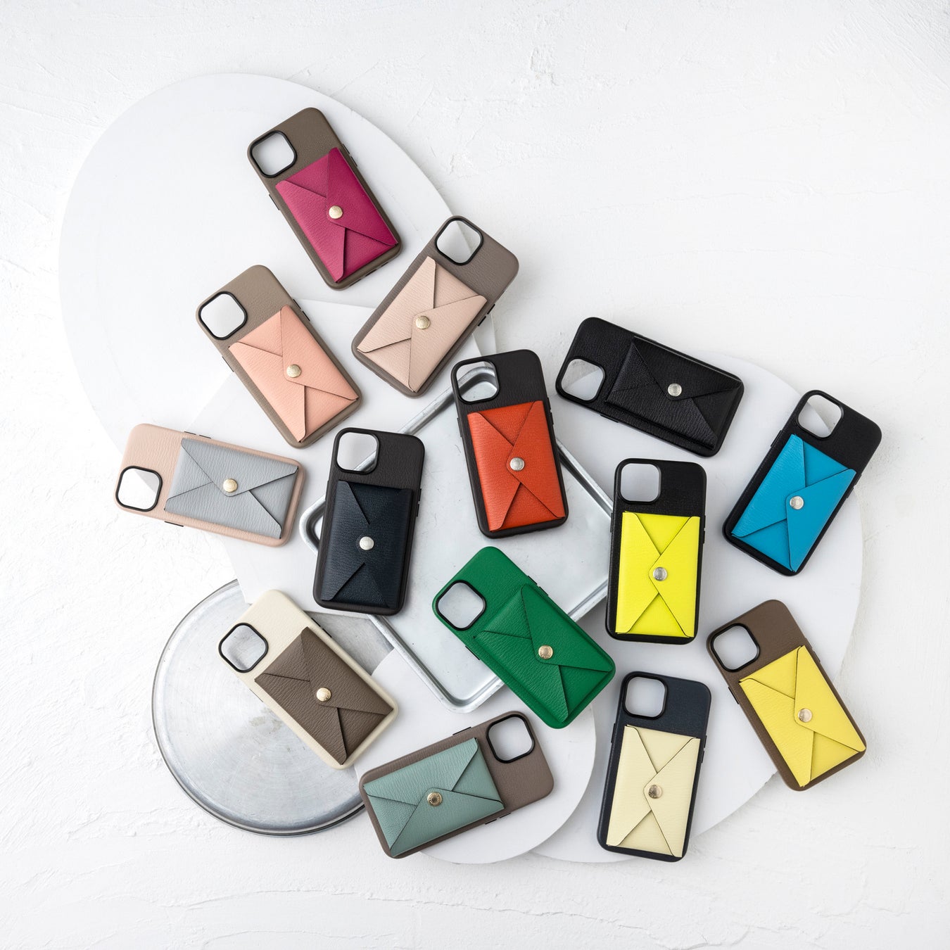 背面のエンベロップデザインが特徴のバックカバーシリーズは、デザイン性だけではなく昨今のライフスタイルに合う実用性も兼ね備えています。エンベロップには使用頻度の高いICカードや名刺、クレジットカードなどを収納することが可能。約1cmの幅があり、小銭なども収納することができるため、iPhoneのみでお出かけをすることも可能。