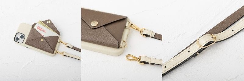 「ショルダーストラップ付バックカバーiPhoneケース」は肩や首からかけていただくことで、ポケットの無い衣服を着用される方でも両手を空けることが可能。iPhoneケースとレザーショルダーストラップはナスカン仕様で繋げていますが、ライフスタイルに合わせて取り外してもご使用いただけます。レザーショルダーストラップは5段階で長さ調節ができるように作られているため、洋服に合わせて長さを調整することができます。
