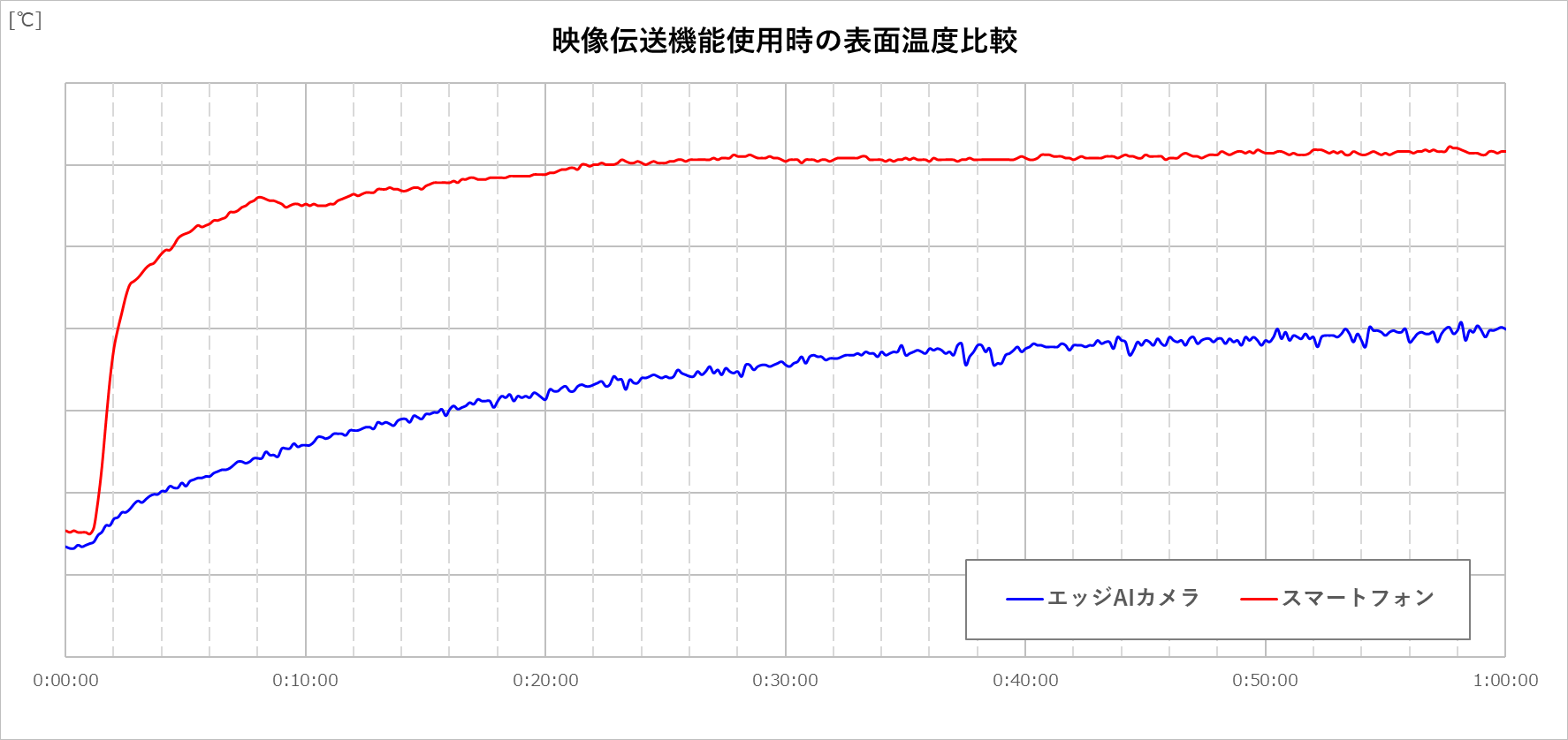 エッジAIカメラは独自の放熱構造により、通常のスマートフォンでは実現が難しい、気温35度以上の過酷な高温環境下でも、長時間の安定した映像伝送が可能です(注3)。