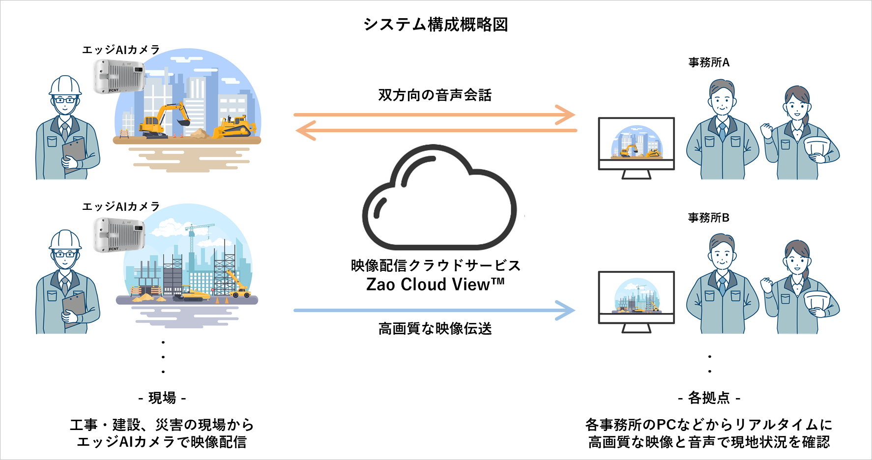 このような課題に対し、独自の放熱構造と防水防塵対応と、可搬性や設置・撤去の自由度が高いFCNTの「エッジAIカメラ」を、ソリトンシステムズが提供する「Zao Cloud View™」の映像配信デバイスとして使用することで、工事・建設現場や災害現場などに代表される高温かつ屋外の過酷な環境下でも長時間、安定した映像伝送を実現することが可能となりました。