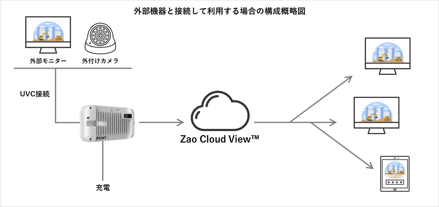従来、工事・建設現場や災害現場などで「Zao Cloud View™」を利用する際の映像配信デバイスとしては、専用デバイス Zao-Xに加え、作業員などが持つ業務用のスマートフォンが利用されていました。しかしながら、スマートフォンの場合、炎天下などの過酷な環境下で本ソリューションを利用すると、利用開始後10数分程度で熱による機能制限が生じ、長時間、安定して映像配信ができない課題が顕在化していました。また、外付けカメラや外部モニターの映像を取り込み、スマートフォン経由で「Zao Cloud View™」に映像配信する使い方においては、外部機器との接続と充電を共存させることができず、長時間の利用ができない課題もありました。