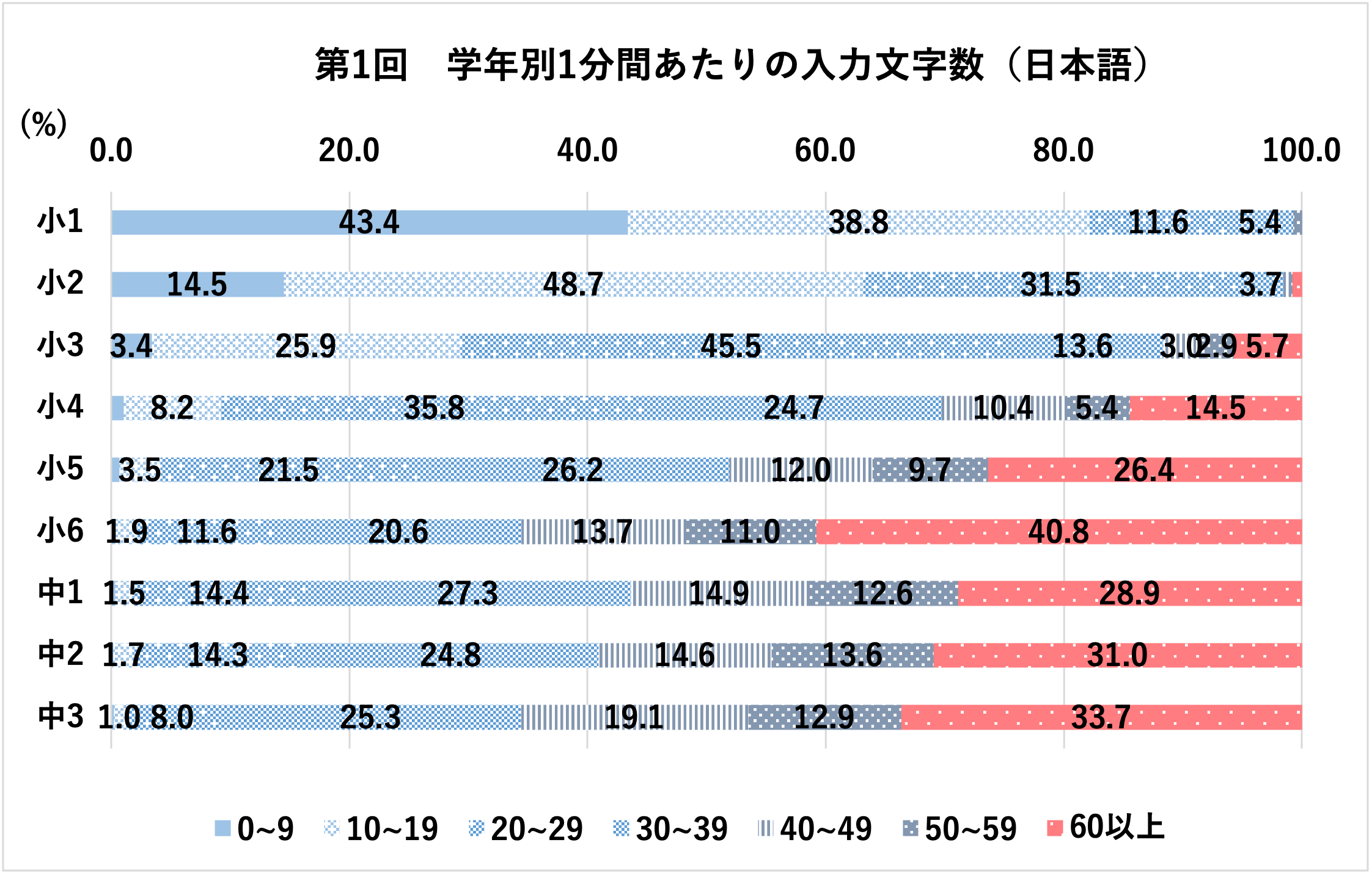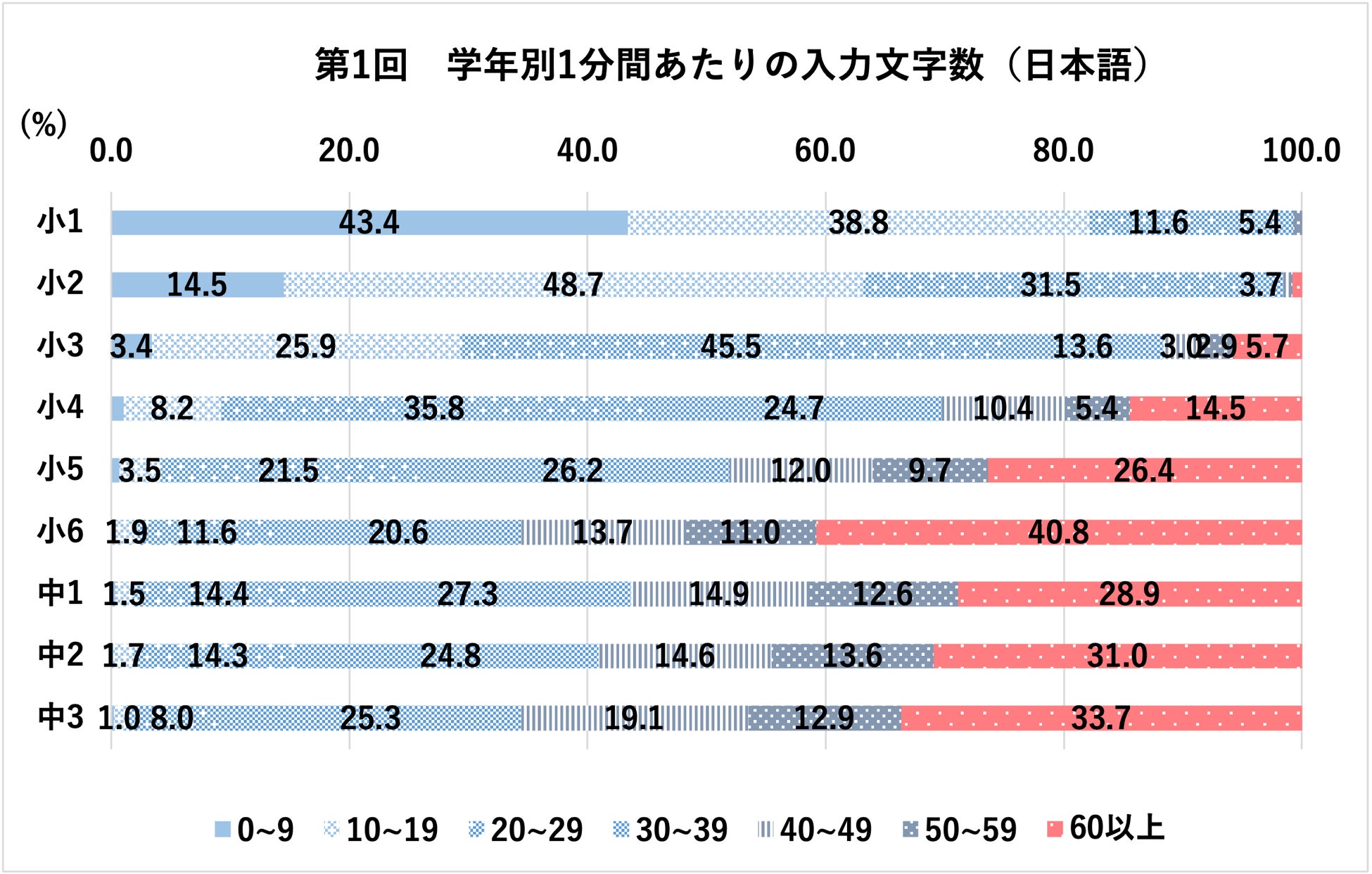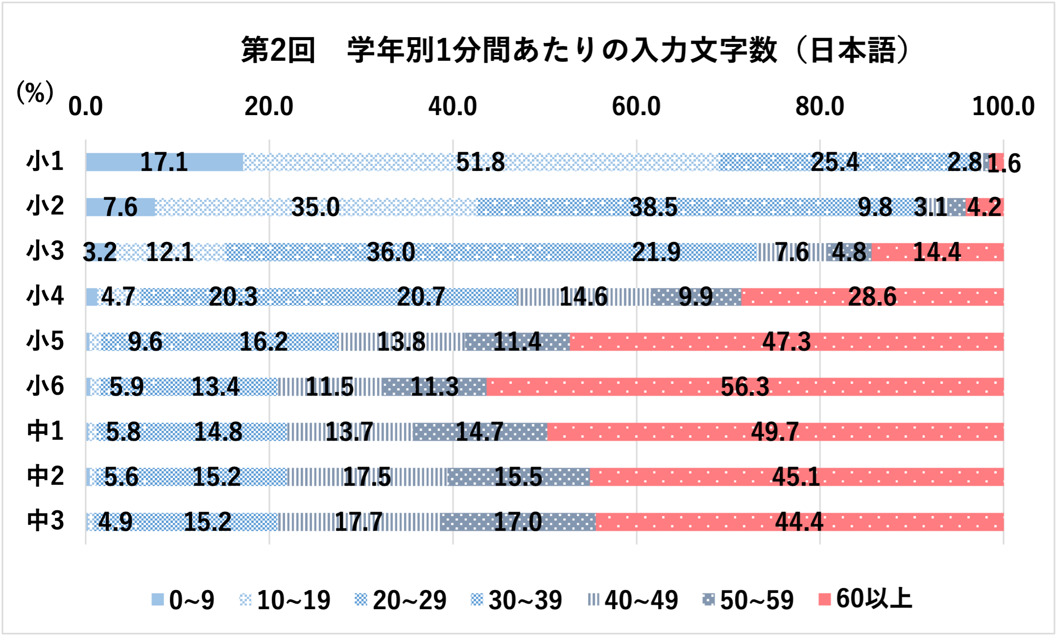 第2回調査では基準となる60文字/分以上入力できる児童生徒が全学年で増加し、小学5年生以上の全ての学年で4割を超えていることが明らかになりました。