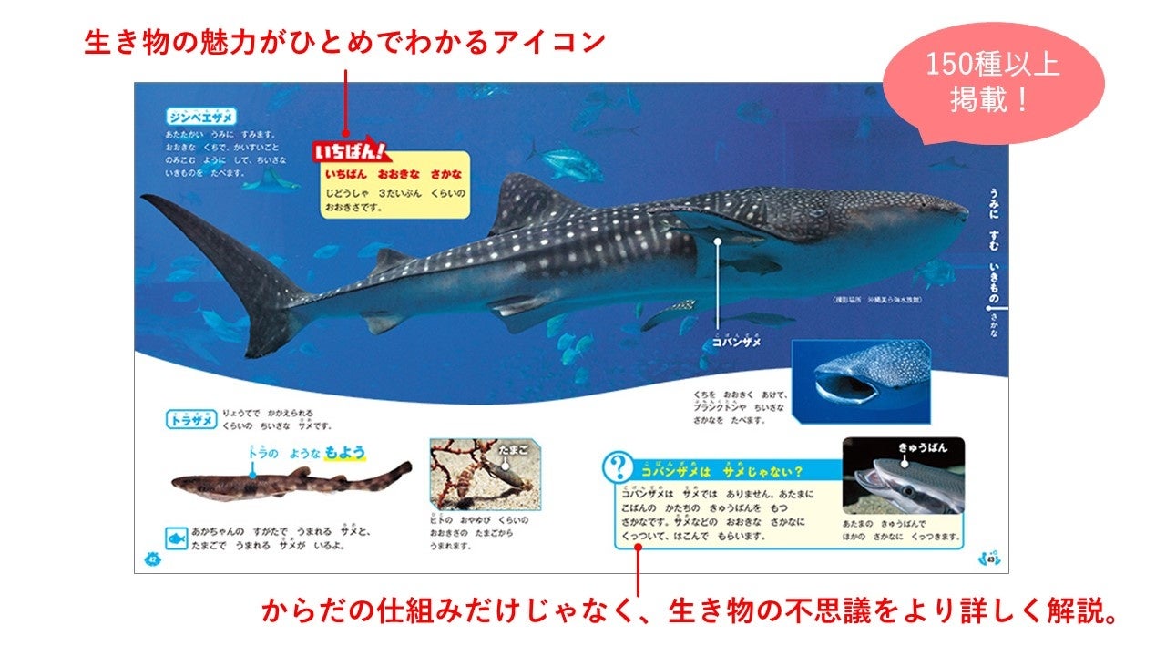 - POINT① 子どもたちが大好きな水辺と水族館の生き物が迫力・拡大写真で楽しめる。