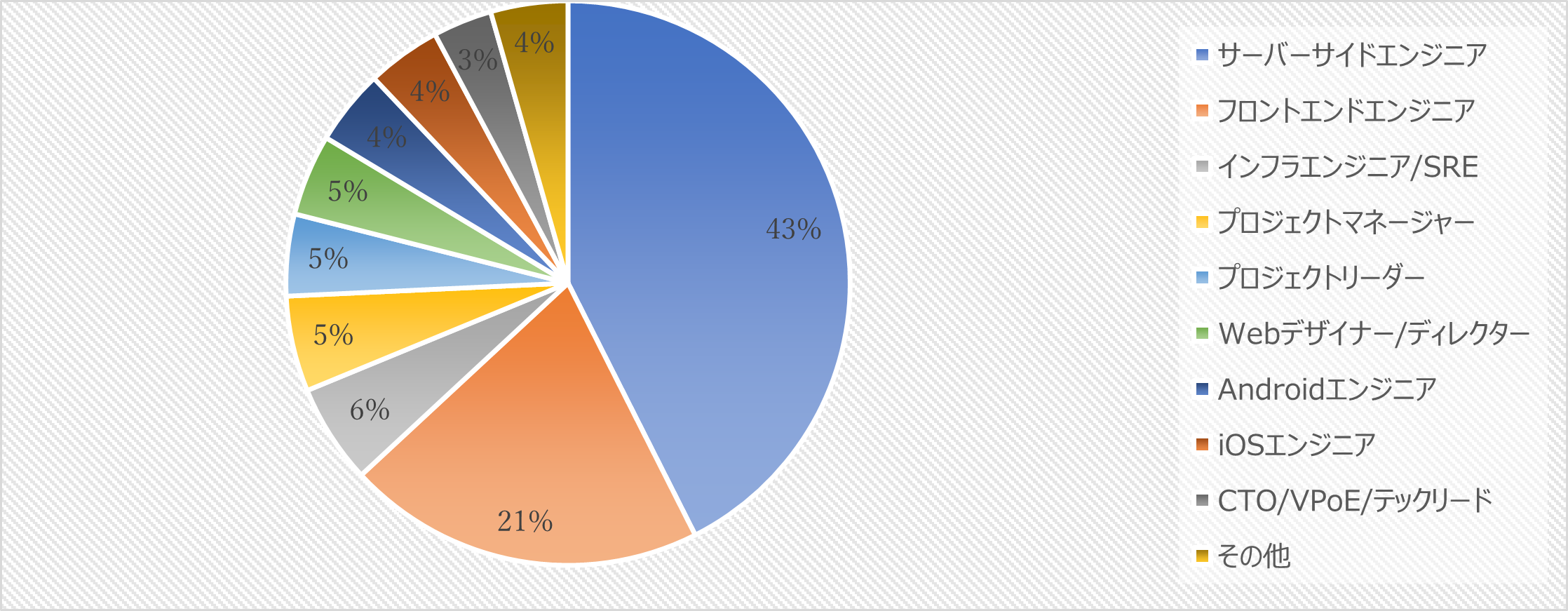 開発案件において必要人数が多いサーバーサイドエンジニアが、フルリモート案件としてもボリュームゾーンという結果になりました。2位はフロントエンドエンジニアで21%と、上位2職種で全体の60%を超える件数であり、システム開発に携わるエンジニアであれば、フリーランスとしてフルリモート案件を選択できる状況であることが分かります。