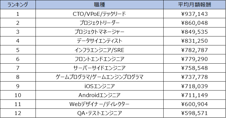 ✓職種別ランキング1位はCTO/VPoE/テックリードで約93.7万円