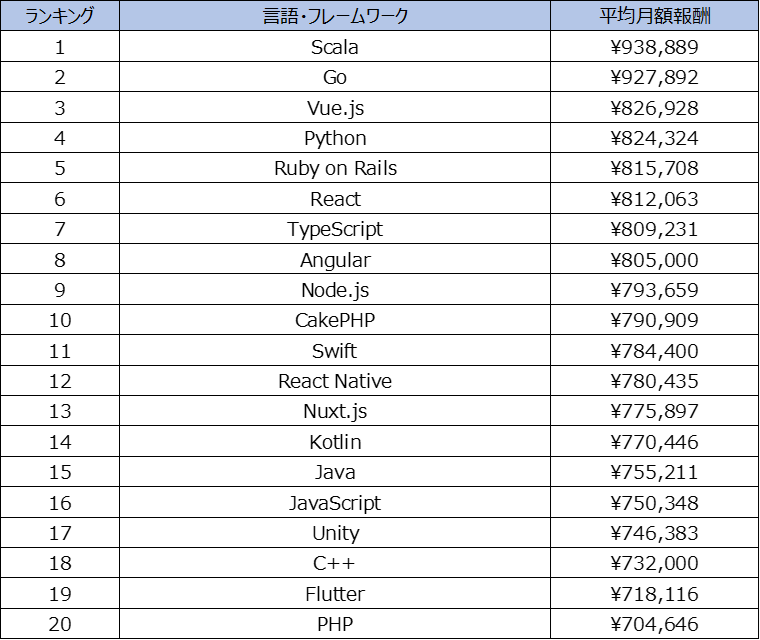 言語・フレームワーク別の月額報酬ランキングでは、モダンな技術として注目され、企業からのニーズが増加している、「Scala」「Go」がトップ2にランクイン。3位は、フロントサイドの言語として主流の「Vue.js」がランクイン。一方、最近目にする機会が多い「Python」は、機械学習やデータ分析などに応用可能なスキルを持っていると高額となりますが、通常の言語として扱う案件も多く含まれるため、4位という結果になりました。
