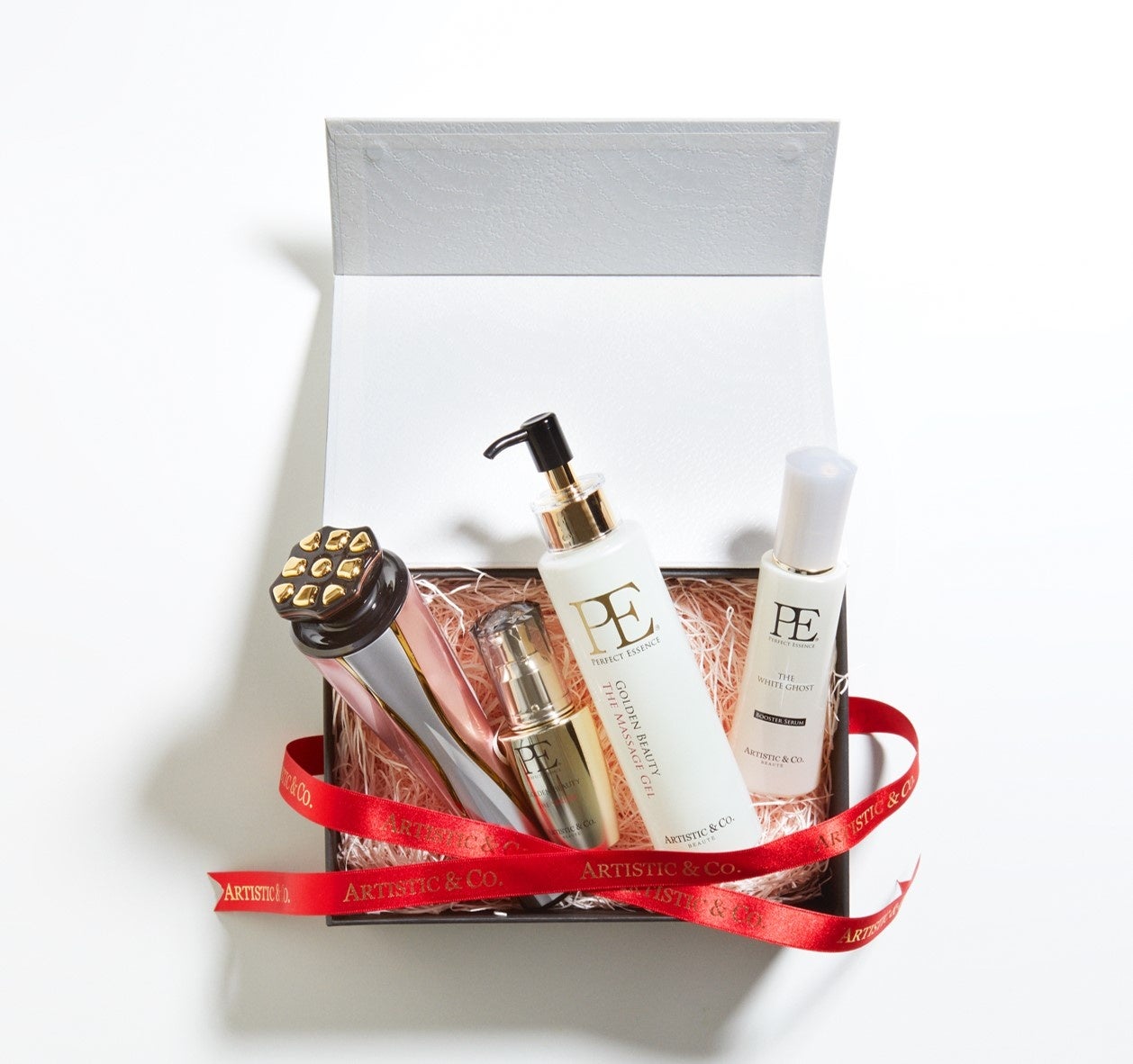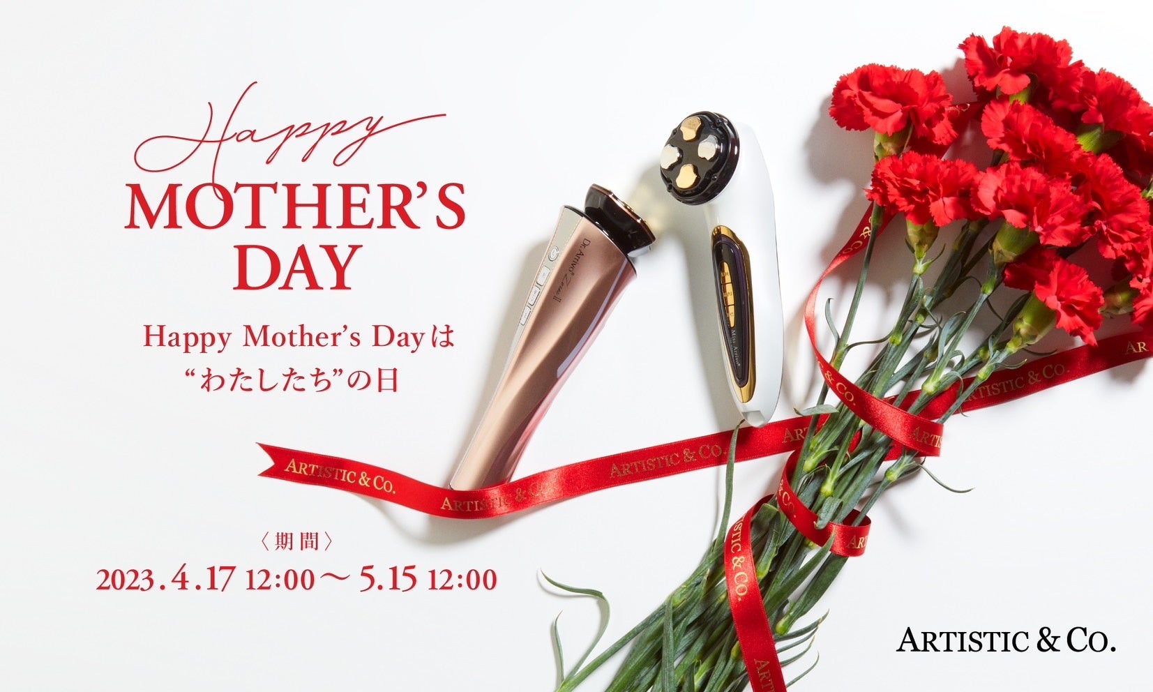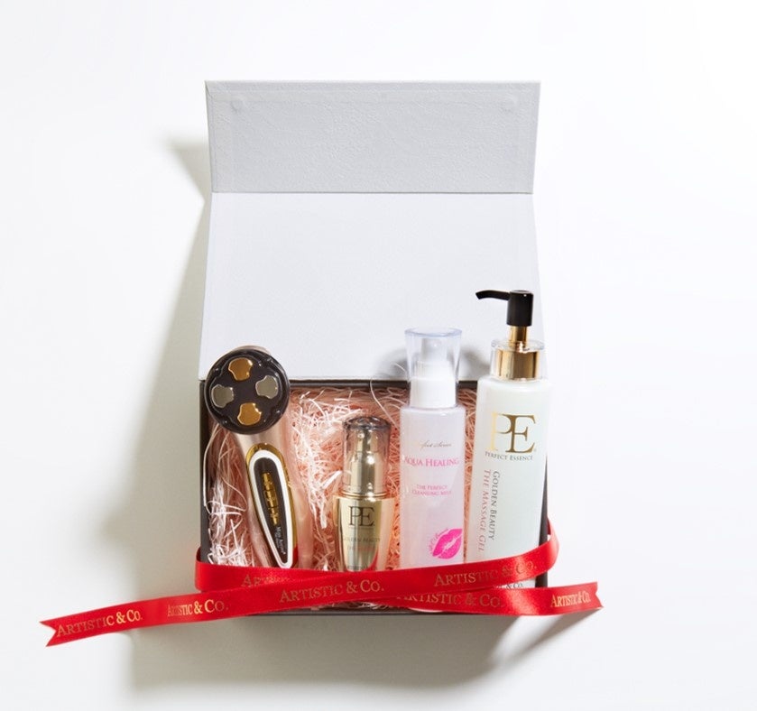 世界で累計100万台以上の販売実績がある「ARTISTIC&CO.」から母の日限定のセット商品が登場します。家庭用美顔器「ミスアリーヴォ ザ・レイス」や美顔器使用時の美容液としておすすめの「PE ゴールデンビューティー ザ セラム」等をセットにした、洗浄から、引き締め、保湿ケアまで叶えるギフトボックスや、「PE ザ ホワイトアウト シリーズ」をセットにした、医薬部外品としてW承認されたスキンケアラインのギフトボックスなど、お悩みやニーズに合わせた全5種類のギフトボックスを展開します。コンパクトかつサロンクオリティを実現した美顔器は、独自の特許技術を取得した「中・高周波による肌の温め」「EMSによる筋肉刺激」「美容成分を深く浸透させるインサートパルス」の3つを同時に行う機能「MFIPモード」を搭載。リフトアップ効果や肌質ケア、エイジングケアへの確かな実感を得られる高い機能と、手にフィットし流れるようなシェイプデザインが注目を集める人気の商品です。