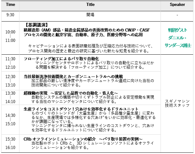 基調講演にワシントン大学教授(元ボーイング社シニアテクニカルフェロー)のダニエル・サンダース博士を招き、「積層造形部品・鋳造金属部品の表面改質のためのCWJP・CASF(※2)プロセスの開発と航空宇宙、自動車、原子力、医療分野等への応用」をテーマに講演していただくと共に、スギノマシン最新技術の紹介を行います。この他、自社技術スタッフによる5つのテーマで技術セミナーを行います。