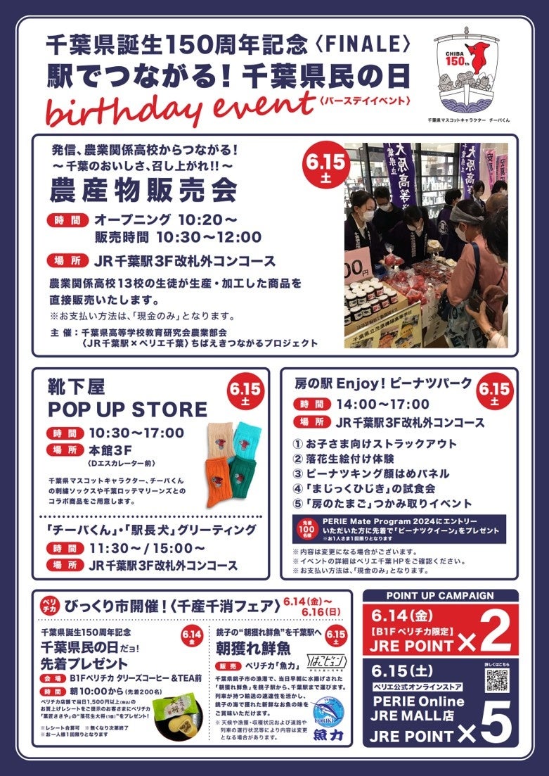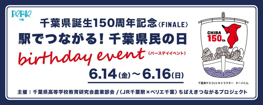 JR千葉駅直結の商業施設「ペリエ千葉」(所在:千葉市)は、2024年6月14日(金)~16日(日)に、JR千葉駅3F改札外コンコースおよびペリエ千葉で「駅でつながる!千葉県民の日 バースデーイベント」を開催します。いよいよフィナーレを迎える千葉県誕生150周年を記念し、千葉県民の日当日は、昨年に続く、農業関係高校生徒による「農産物販売会」の実施や、地元千葉のお土産や名産品を販売する「房の駅」による「体験イベント」、そして期間中は各ショップが千葉県内で採れた食材等をご紹介する「びっくり市<千産千消フェア>」など、地域とつながる千産千消をテーマにした7つの人気イベントが県民の日を盛り上げ、千葉の魅力を発信します。