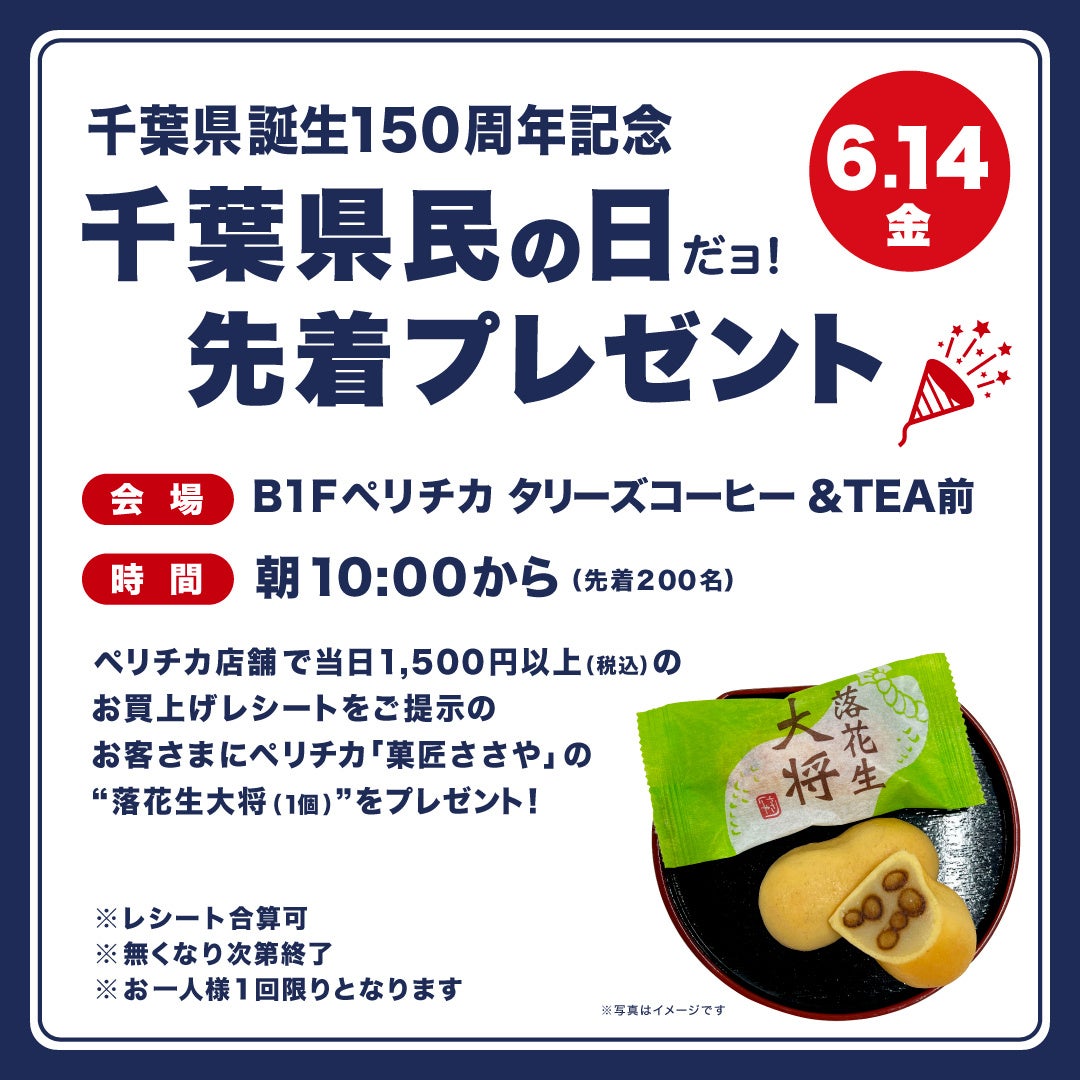 ・開催内容:ペリチカ店舗で当日1,500円(税込)以上のお買上げレシートをご提示のお客さまにペリチカ「菓匠ささや」の落花生大将(1袋)をプレゼントします。