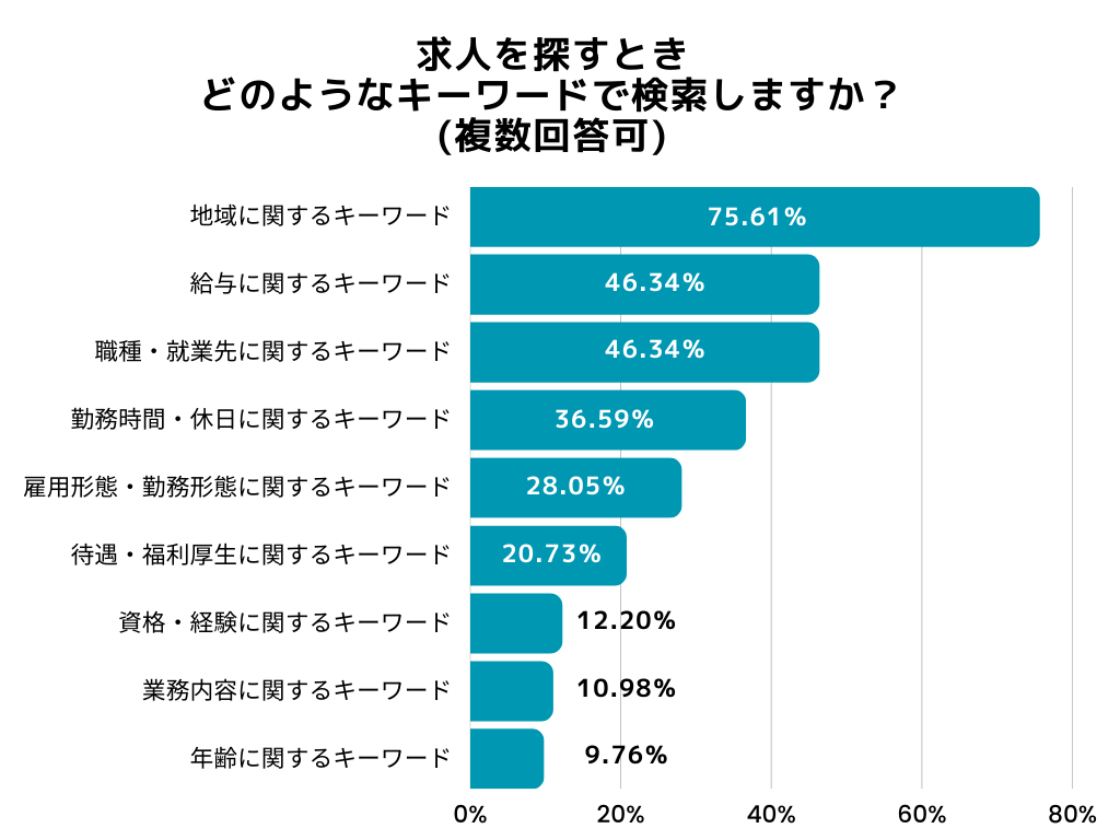 次点で「給与」に関するキーワード、「職種・就業先」に関するキーワードで検索すると回答した方が46.34%という結果になりました。