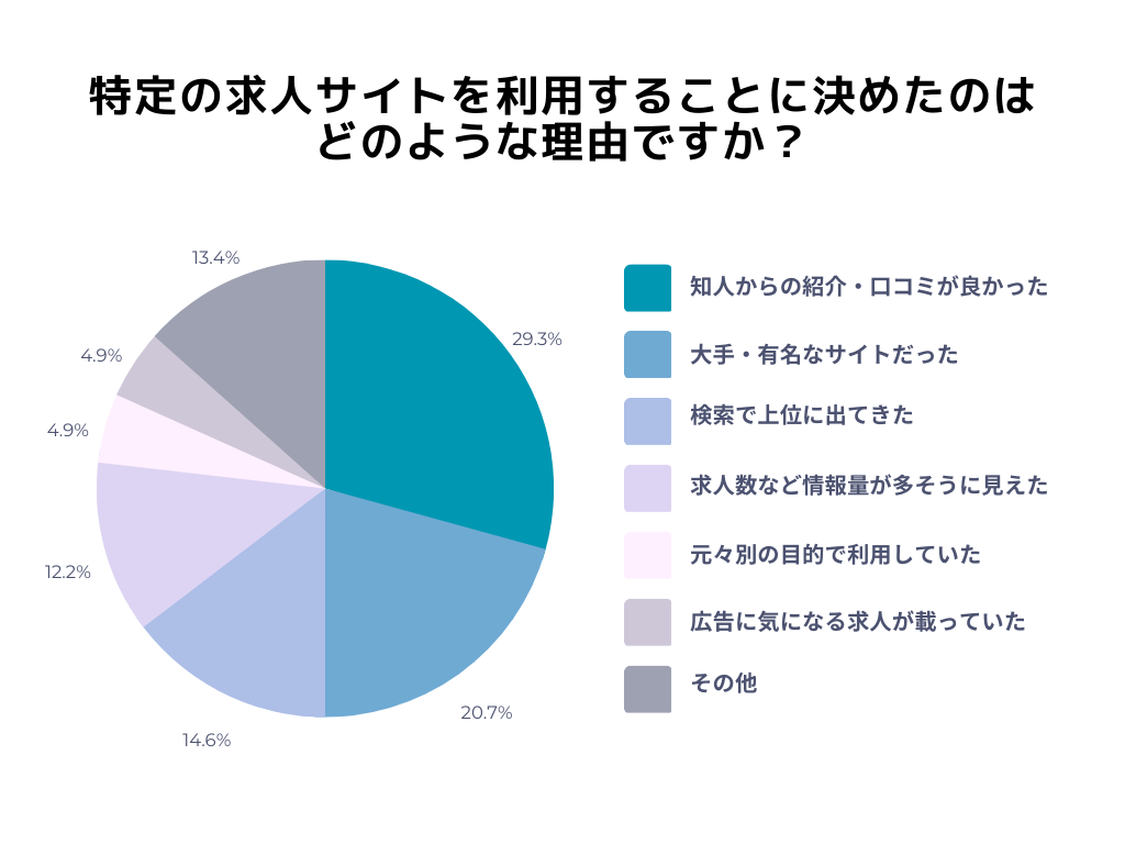 特定の求人サイトを選んだ理由で最も多かった回答は「知人からの紹介・ネットの口コミが良かったから」が29.27%でした。