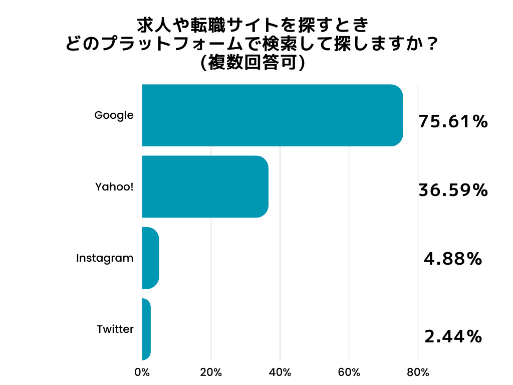 最も多い回答はGoogleが75.61%という予想通りの結果でしたが、Yahoo!が36.59%と、Yahoo!を利用して求人サイトを探している方も少なくない印象でした。