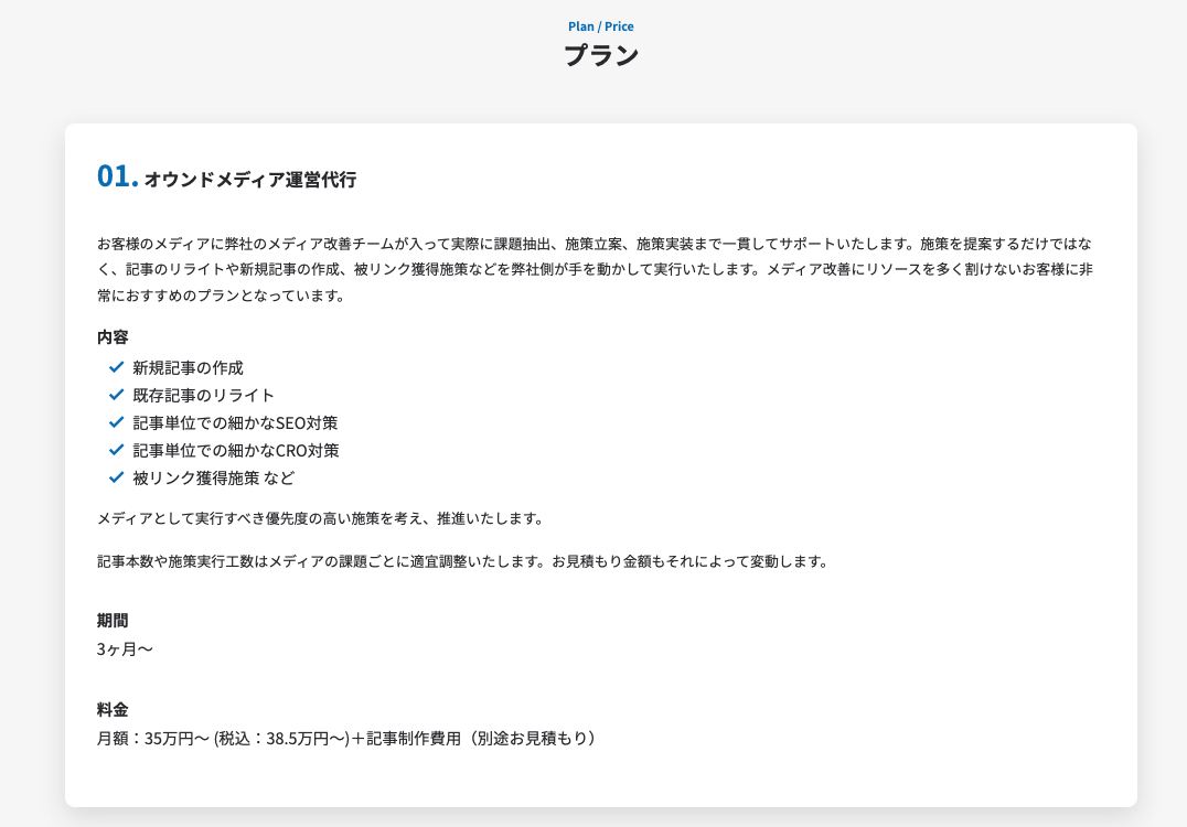 その結果、施策の実行まで手の回らなかったお忙しいお客様のサイトであっても成果を出すことができており、より多くのお客様にオウンドメディア運営代行プランを提供したいと考え、この度プラン詳細ページを新たに開設いたしました。