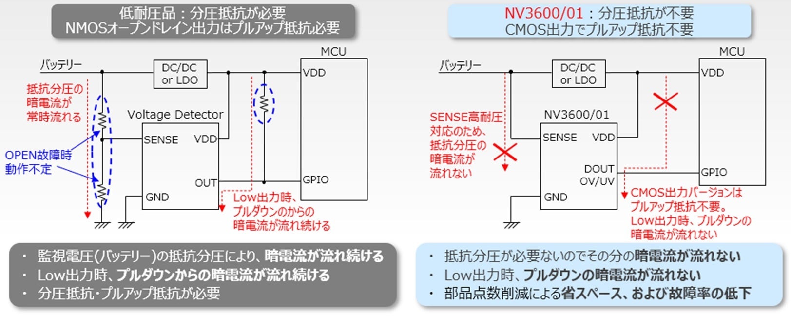 バッテリー電圧など高い電圧を従来のオープンドレインタイプの低耐圧ボルテージディテクタで監視する場合、監視電圧を分圧するための抵抗や出力のプルアップ抵抗が必要となり、部品点数増加や暗電流増加が懸念されます。「NV3600」、「NV3601」シリーズはSENSE端子が高耐圧のため分圧抵抗が不要です。また出力タイプをオープンドレインタイプとCMOSタイプから選択可能であり、部品点数を増やすことなく、暗電流の懸念も解決できます。