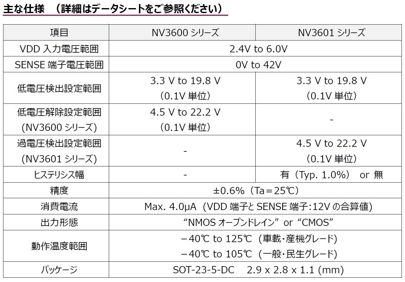 今回当社が発売する「NV3600」と「NV3601」シリーズは上記課題を解決し、自動車の補機バッテリーや産業機器のAC/DC出力電圧などの電圧監視において、消費電力を気にすることなくシステムの安全性を向上させる製品です。日清紡マイクロデバイス株式会社は、今後も業界との連携を深化させ、技術の進歩を追求してまいります。