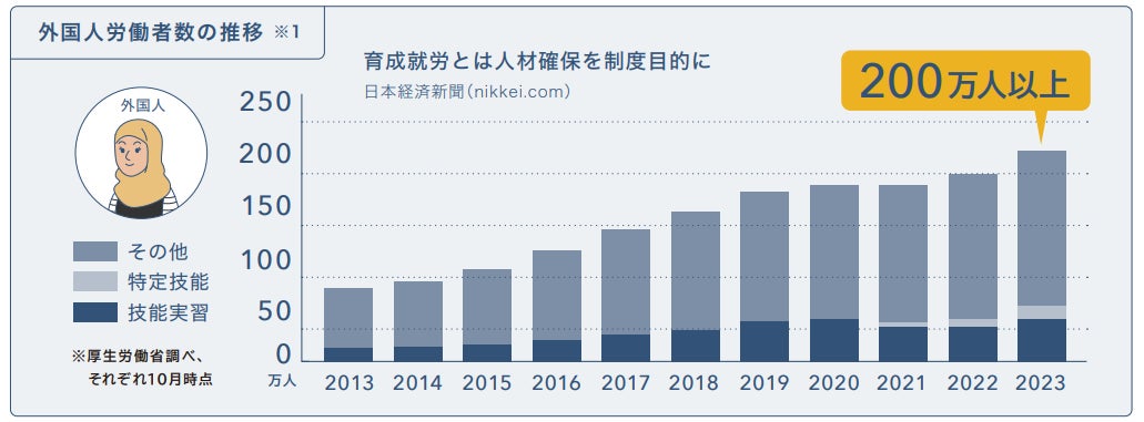 少子高齢化に伴い労働力人口が減少する日本では、外国人材活用の需要が高まっています。厚生労働省によると、2023年には日本で働く外国人の人数が初めて200万人を超え、前の年と比べて22万5,950人増加しました。