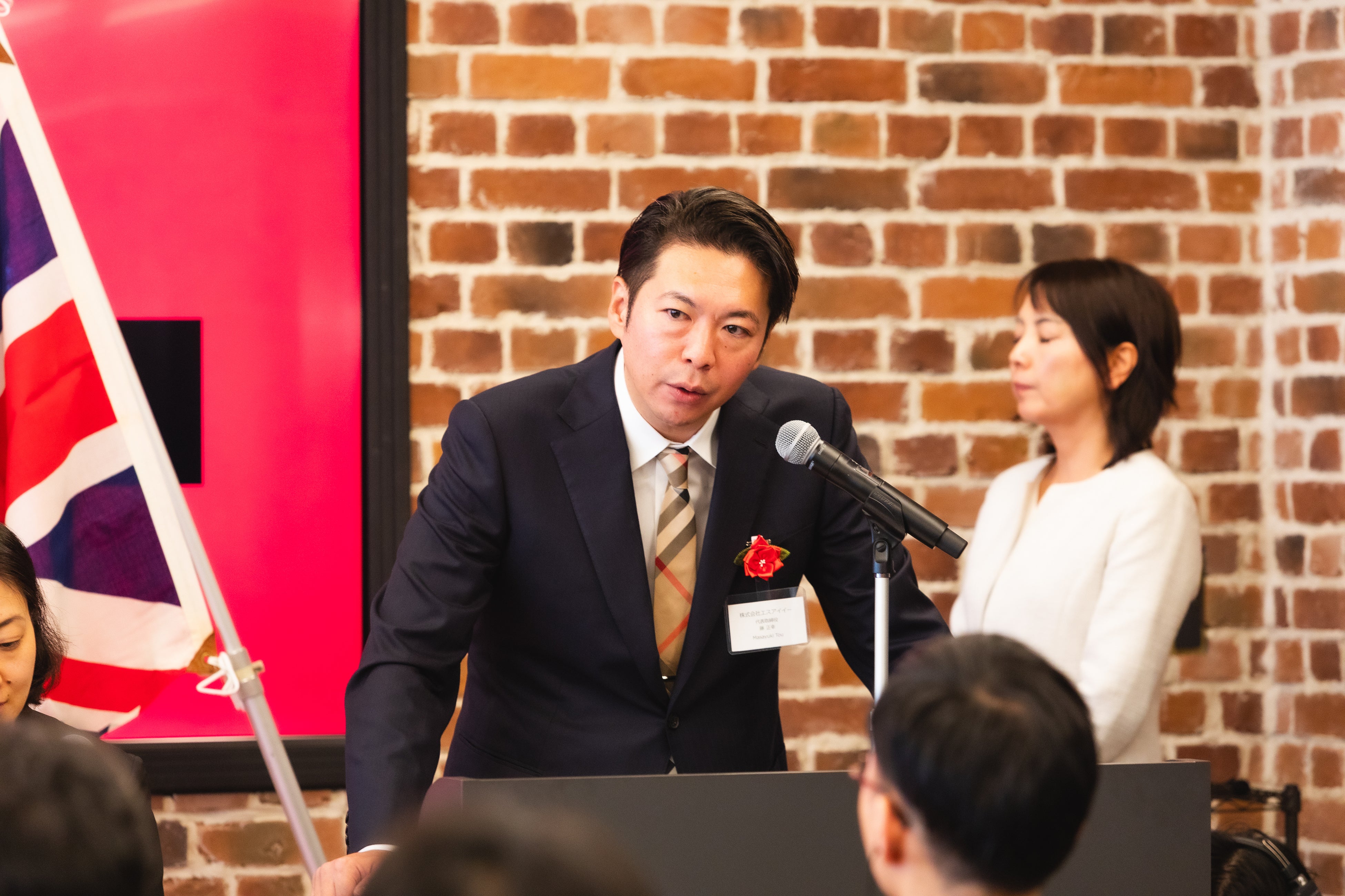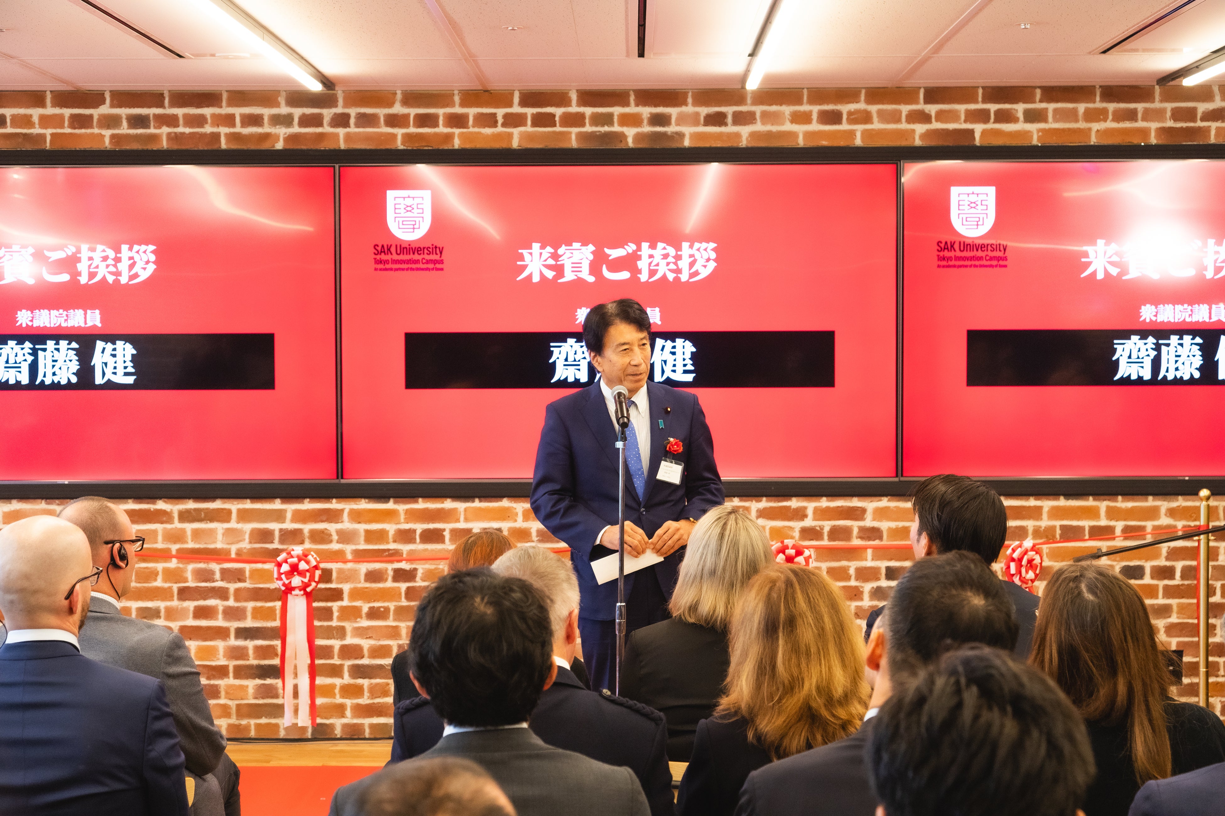 その後、株式会社エスアイイー代表取締役社長 藤 正幸が本校を開校した背景や想いを交えながら主催者挨拶を行い、続いて来賓ご挨拶として、エセックス大学のララ・アンダーソン副学長、駐日英国大使館の古閑澄子上席商務官、ブリティッシュ・カウンシルのジム・ブース駐日代表、元経済産業大臣の齋藤健衆議院議員に順次ご登壇いただきました。