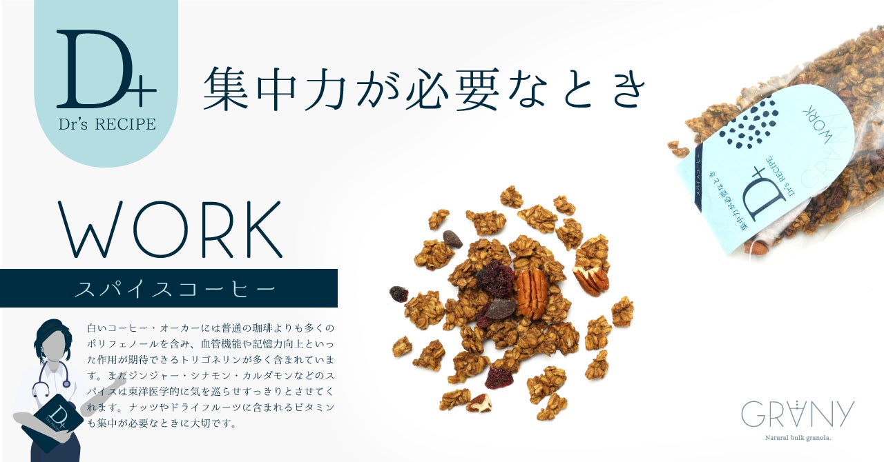 「集中力」をテーマにした、仕事や勉強時のパフォーマンスの向上にアプローチしたグラノーラです。記憶力の向上が期待できる、トリゴネリンを多く含むコーヒー豆(オーカー)を使用し脳の働きをサポートします。東洋医学的に気を巡らせる、ジンジャーやカルダモン・シナモンの3種類のスパイスを配合し気分をすっきりさせてくれますので、休憩の合間に摂取することで作業効率を高めることが期待できます。