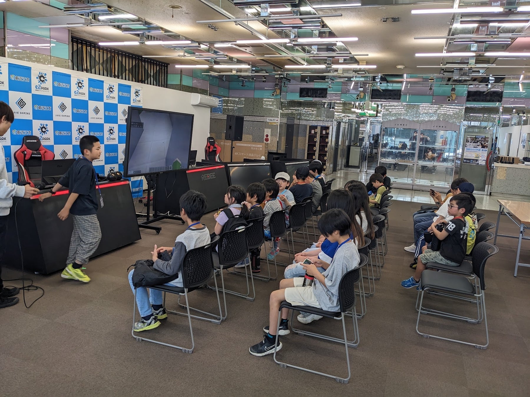 e2PARKのゲーミングPCエリアにて、子どもたちはそれぞれ好きなゲームタイトルをプレイしていました。実際に筐体を使って車の運転を体験できるeモータースポーツや、世界中で大人気のマインクラフト・Robloxなど、最新の機器を使って楽しんでいただきました。普段あまり触れることの無いPCで、ゲームをプレイできたことへの喜びを口にする子どもたちが多く見られました。