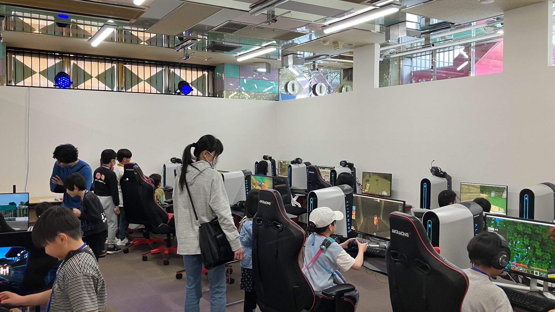 e2PARKは子ども向けのプログラミングスクールや、eスポーツに触れることができる場を提供しているデジタル教育施設です。本イベントの最初のプログラムとして、このe2PARKの施設紹介を主催の妹尾 優佐さんにしていただきました。妹尾さんがマインクラフトで作成したe2PARKオブジェクトをモニターに映し、その作品でそれぞれの教室について説明した後、ツアーのように実際に施設全体を回って紹介しました。この紹介によって児童たちは施設に対する理解が深まり、その後のイベントをスムーズに行うことができました。