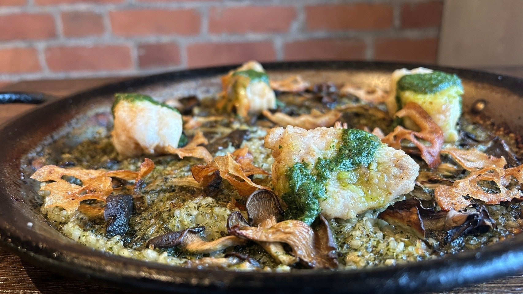 パエリアでアンコウ鍋を表現したユニークな一品。