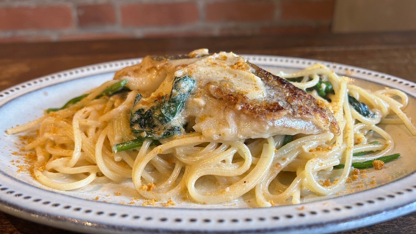 大ぶりの真鱈はお好みで崩しながらパスタとあえてお召し上がりください。
