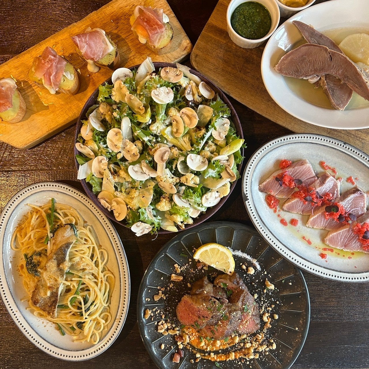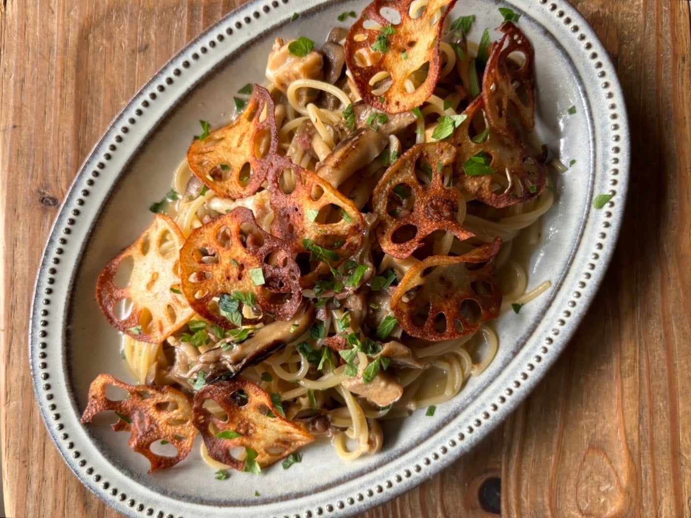 肉厚で食感も楽しめるため、相性が良いレンコンや生ハムと合わせました。