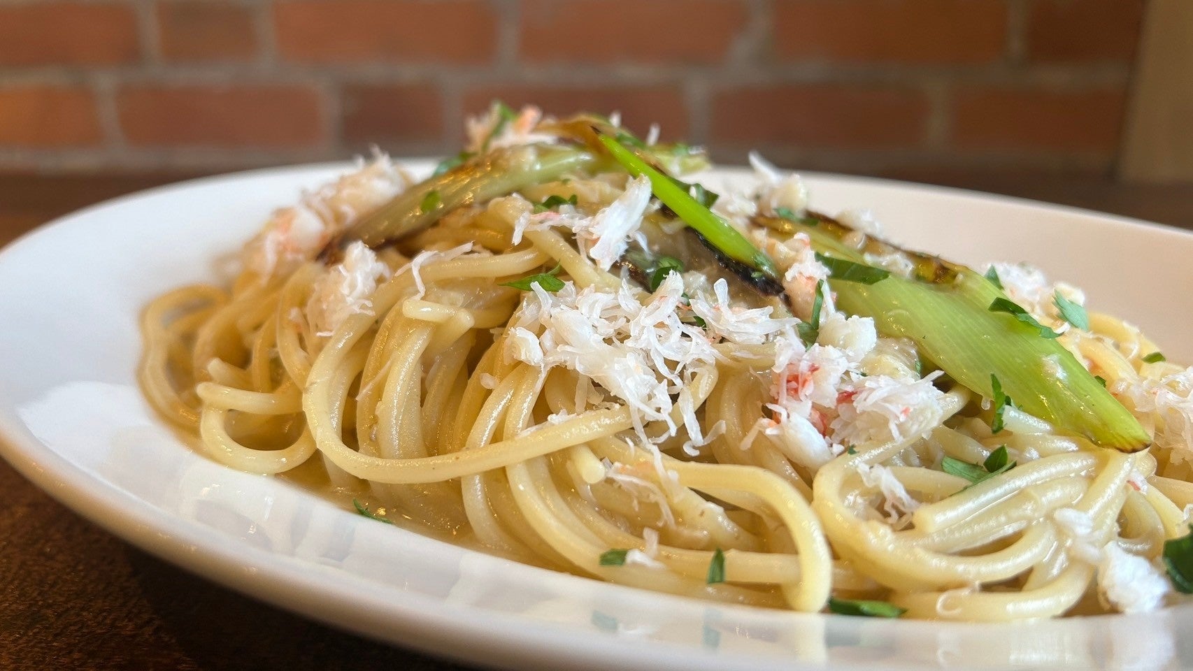 香ばしいシャキシャキとした焼きねぎと、ジューシーな蟹の身の相乗効果で