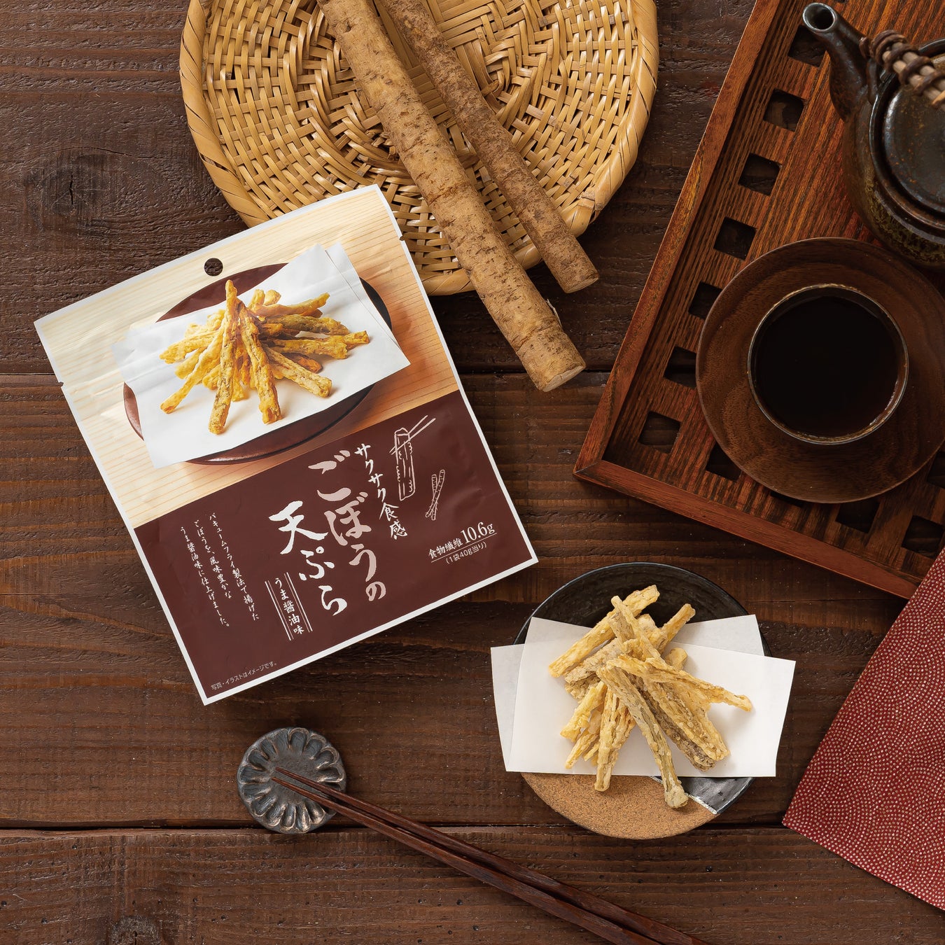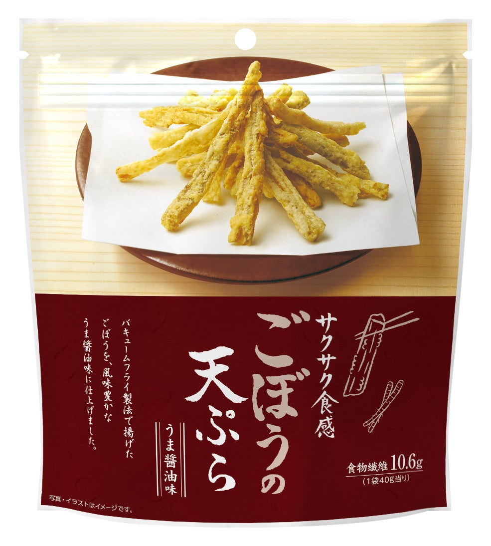特長 :バキュームフライ製法で揚げたごぼうを、風味豊かなうま醤油味に仕上げました。素材の旨味が凝縮されたごぼうの天ぷらのスナックです。