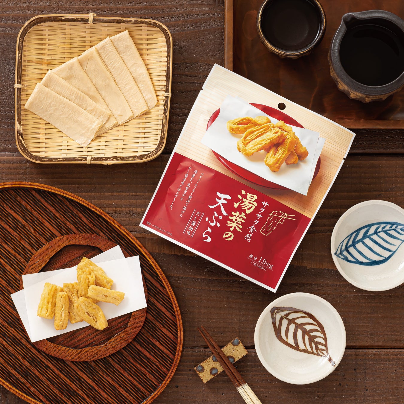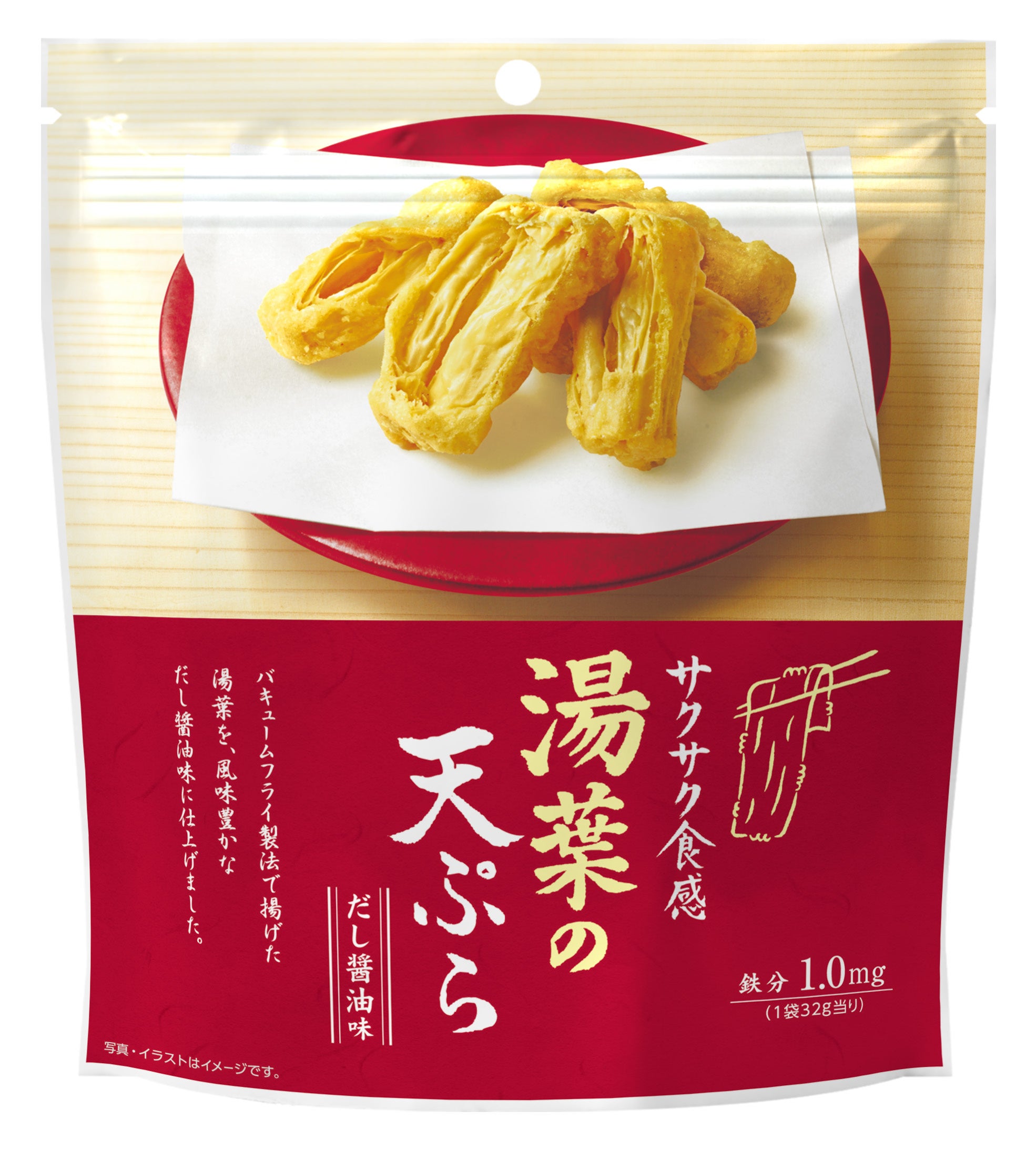 特長 :バキュームフライ製法で揚げた湯葉を、風味豊かなだし醤油味に仕上げました。素材の旨味が凝縮された湯葉の天ぷらのスナックです。