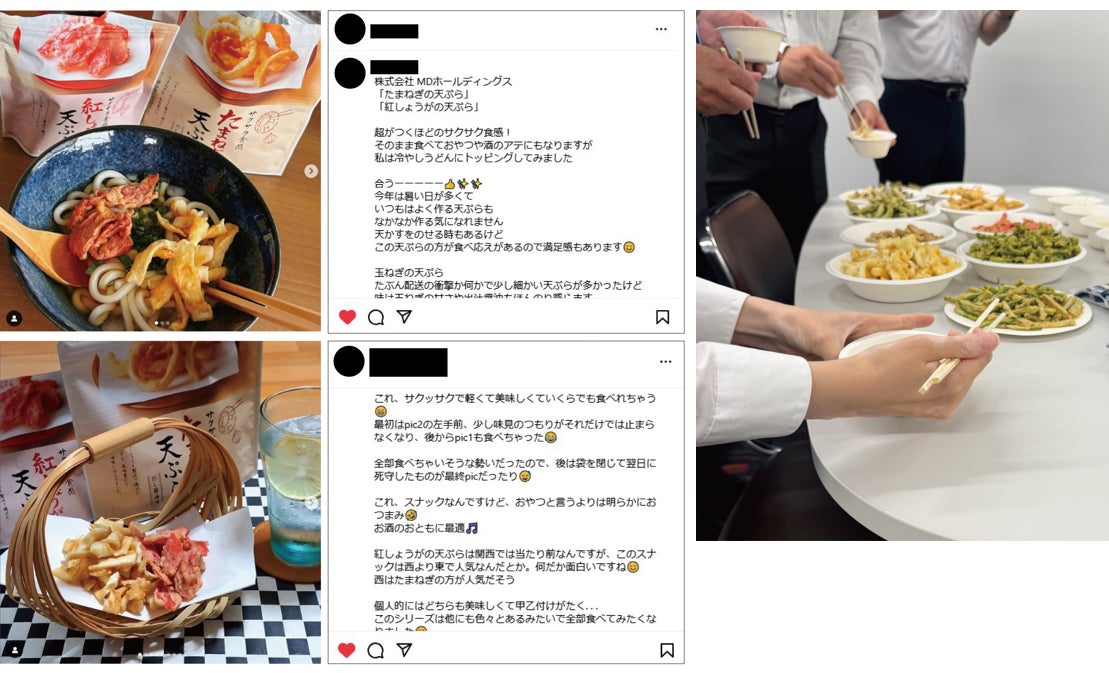 『天ぷらのお菓子』シリーズは、アレンジレシピにもぴったりです。特に、温かい蕎麦や冷たいそうめんとの相性が抜群で、『天ぷらのお菓子』シリーズのサクサク感と野菜の風味が、麺のつるっとした食感と絶妙にマッチします。社内で実施した試食イベントやSNSでのキャンペーン企画でも大好評を博し、「サックサクで軽くていくらでも食べられる」「味見のつもりが止まらない」といった声が寄せられました。また、チャック付きのパッケージで利便性も高く、おつまみやおやつとしてだけでなく、様々な食シーンで楽しめるスナックとして最適なアイテムとして評価されています。