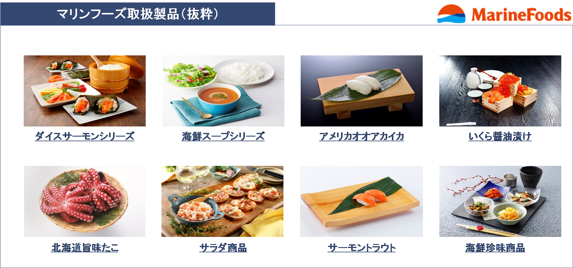 マリンフーズの主な取扱商品である寿司種は、提携工場や自社工場で差別化された技術を駆使して加工しており、付加価値の高い製品を幅広く提供しています。また、高い販売力を背景に、厳選した水産原料(サーモン、イカなど)を安定的に調達し、顧客ニーズに沿う商品を供給できる盤石なバリューチェーンを構築しています。