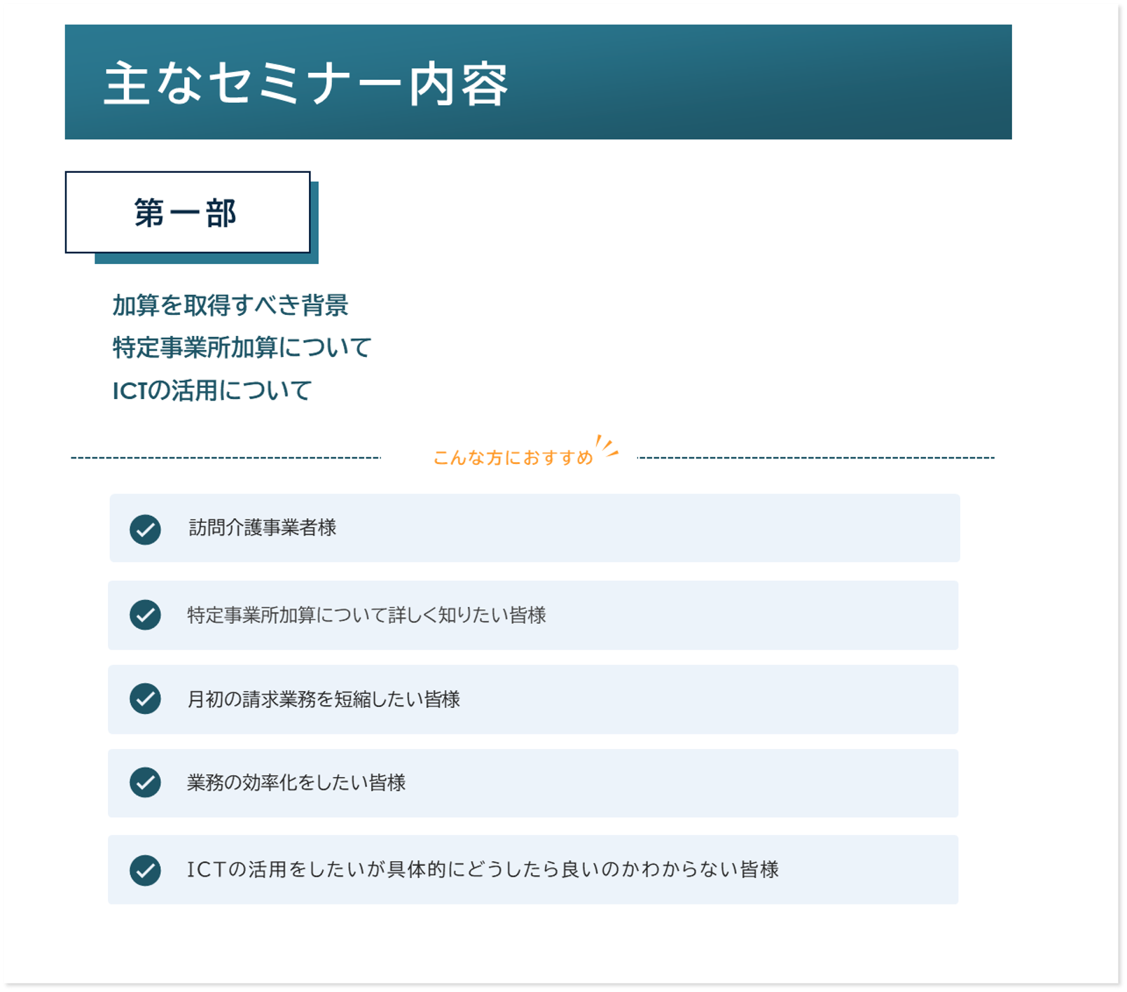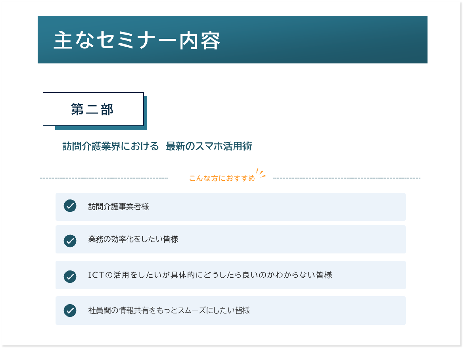 第一部では、特定事業所加算について、ICTの活用による最低限の負担で収益改善が可能となる方法をご説明いたします。また第二部では訪問介護業界における最新のスマホ活用術をお話しいたします。