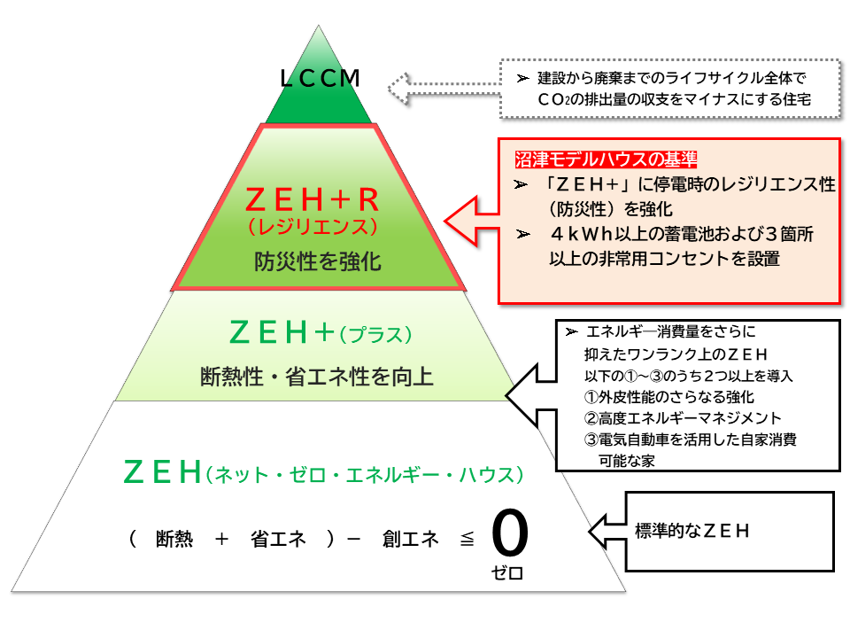 今回の沼津モデルハウスは、省エネ性・快適性をより一層高めるとともに、自然災害への防災性も兼ね備えた「ZEH+R(ゼッチ・プラス・レジリエンス)」相当の仕様となります。