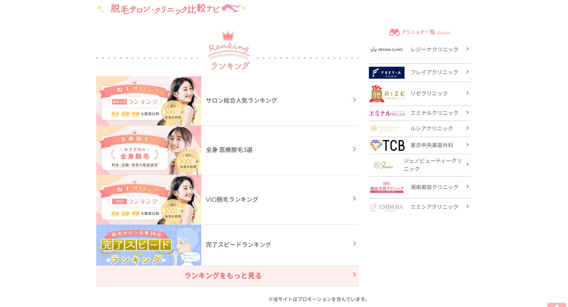 業界最大級の脱毛サロン・医療脱毛クリニックの比較サイト。500人以上のリアルな口コミでランキングを作成し、お得な脱毛サロン、医療脱毛クリニックが一目でわかる。エステ脱毛だけでなく、医療脱毛の情報も満載。