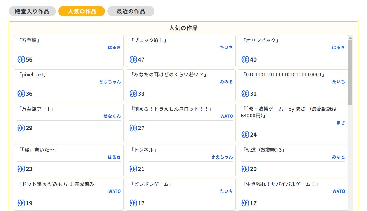 ちゃんプロ上で公開されたプログラムをビュー数や公開日時などを基準に作品を並べ替え、探しやすくしています。