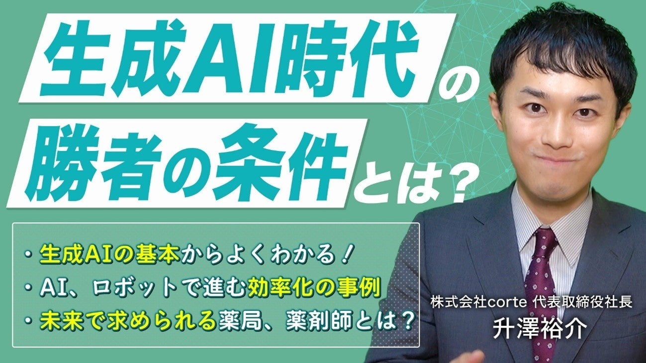 本セミナーでは、元YouTuberでTV出演経験もある株式会社corte 代表取締役の升澤裕介氏を講師に迎え、生成AIの基礎から活用事例、薬局業務への応用までを深掘りします。さらに、アメリカの薬局業界に大きな影響を与えたAmazonファーマシーの取り組み事例や、AI時代に求められる薬局・薬剤師の役割等についても解説します。