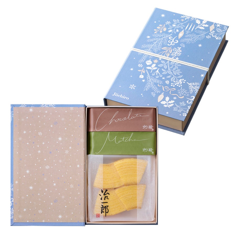 治一郎の定番商品「バウムクーヘンカット」と「ガトーショコラ」を、クリスマスだけの特別なブック型パッケージに詰め合わせました。クリスマスリースをイメージしたパッケージには、ヒイラギやセンリョウなど冬の植物、オーナメント、雪の結晶を華やかにあしらいました。冬の夜空を思わせる上品なブルーを基調とした色彩で、季節の高揚感を感じていただけるデザインに仕上げています。