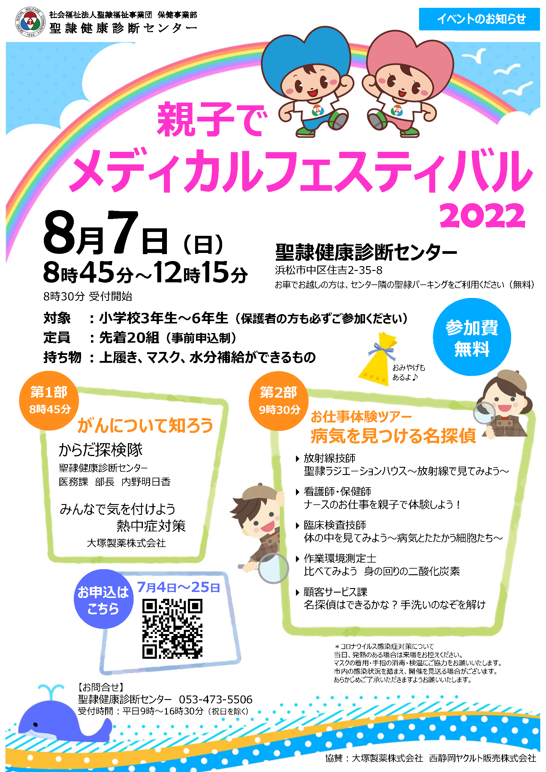 社会福祉法人聖隷福祉事業団(法人本部:静岡県浜松市/理事長:青木善治)の健診機関、聖隷健康診断センター(所長:武藤繁貴)は、夏休みの親子向けイベント「親子でメディカルフェスティバル2022」を2022年8月7日(日)に開催します。