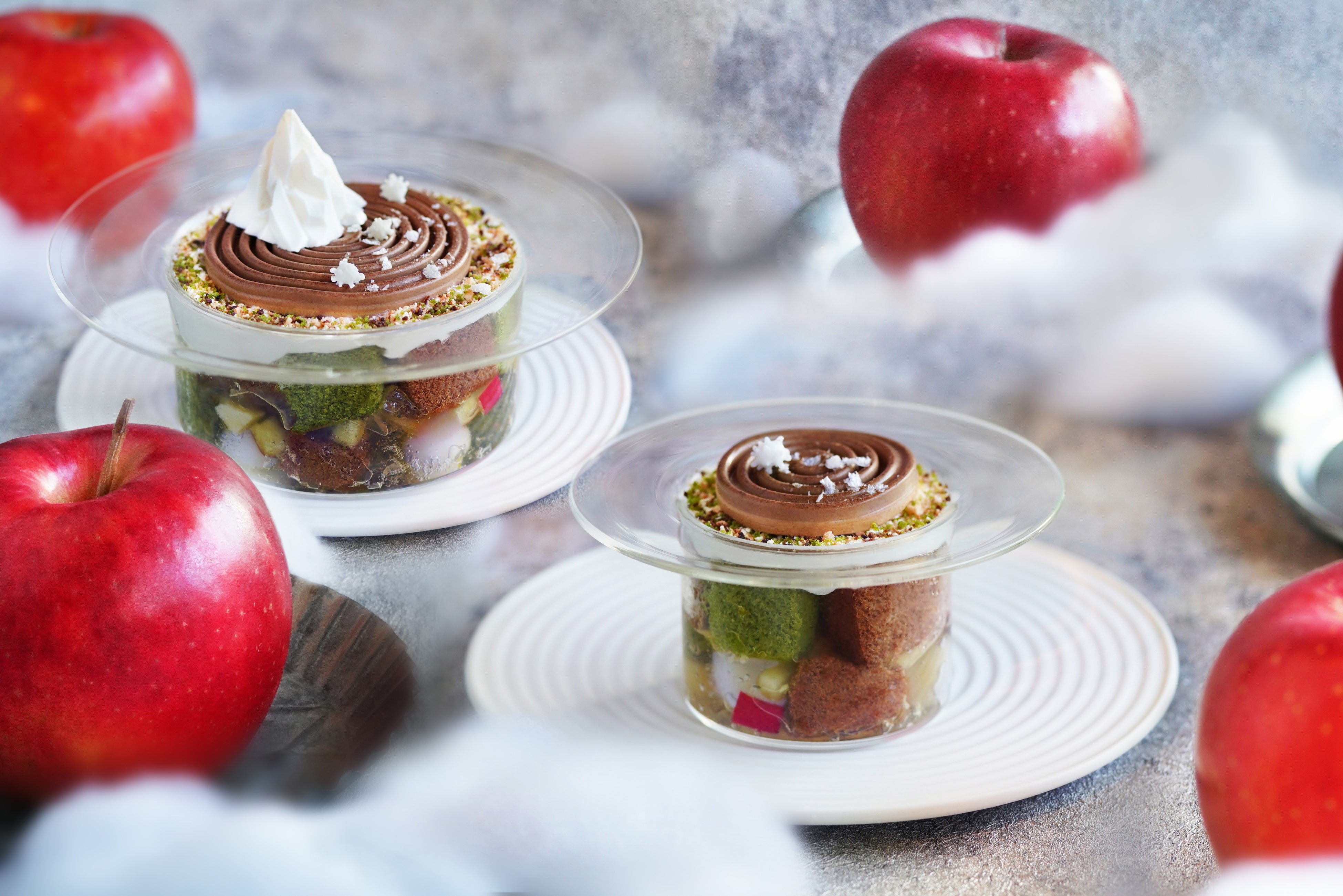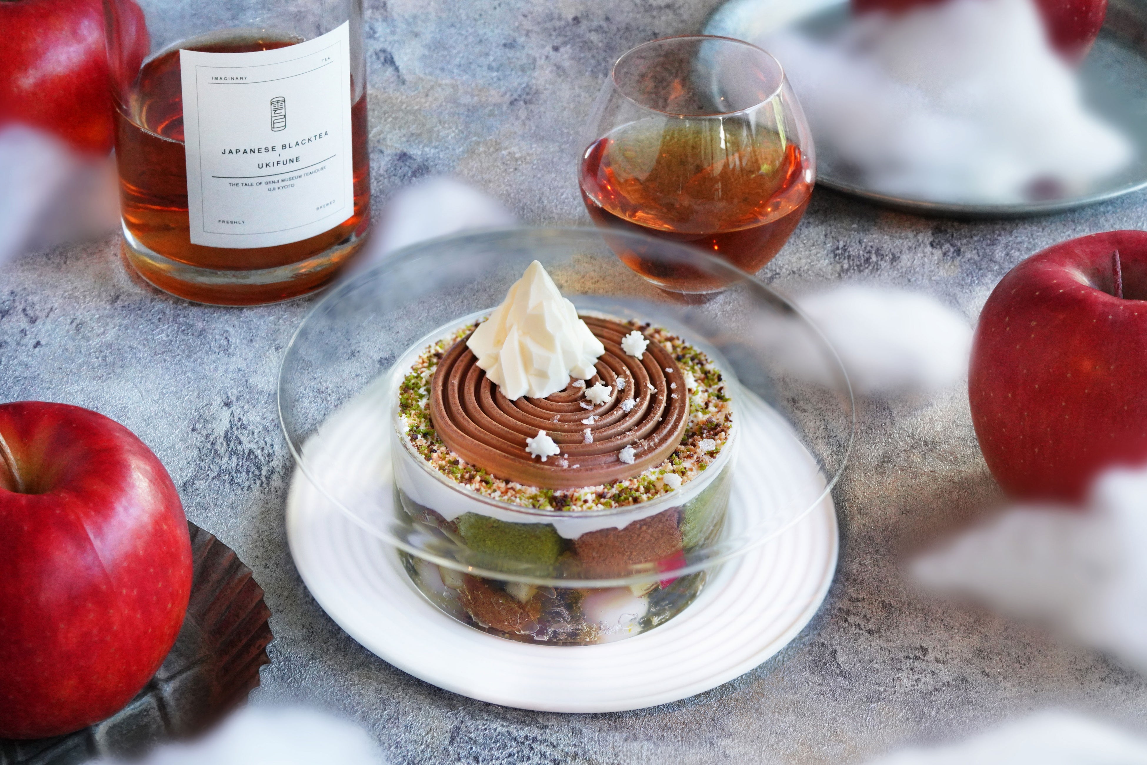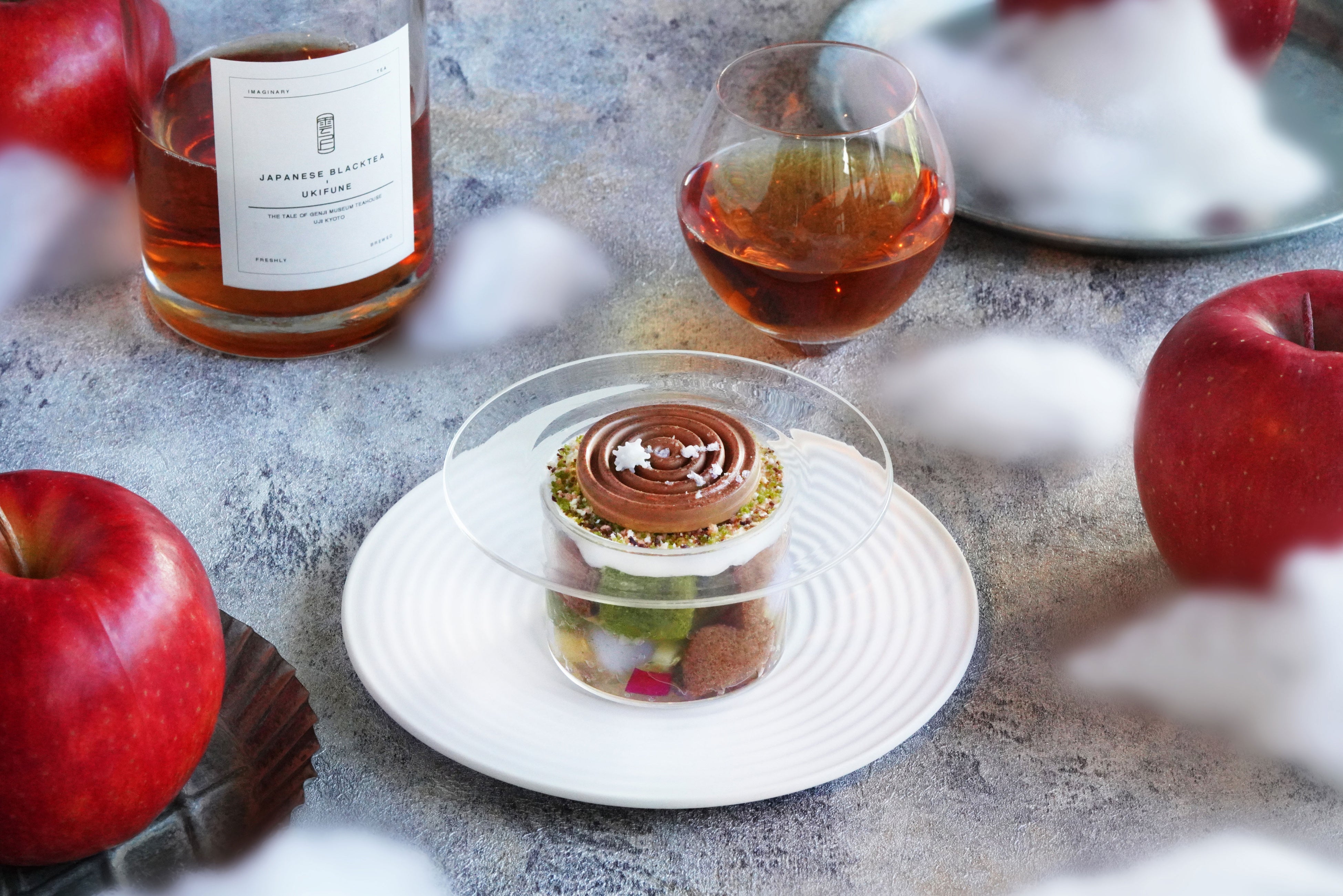 冬の寒さが深まる中、京都宇治『雲上茶寮』に冬季限定スイーツが登場しました。冬の季節にぴったりな、甘い林檎と和紅茶を使ったこのパフェは、フレッシュでシャキッとした林檎の食感と和紅茶の豊かな香りが調和する、冬ならではの贅沢な味わい。パフェのデザインは、洲浜をモチーフとしたムース上に雪山と霜柱が立った様子を表現しており、まるで冬の庭園を散歩しているかのような幻想的なスイーツです。見ても食べても楽しめる贅沢スイーツをぜひご賞味ください。
