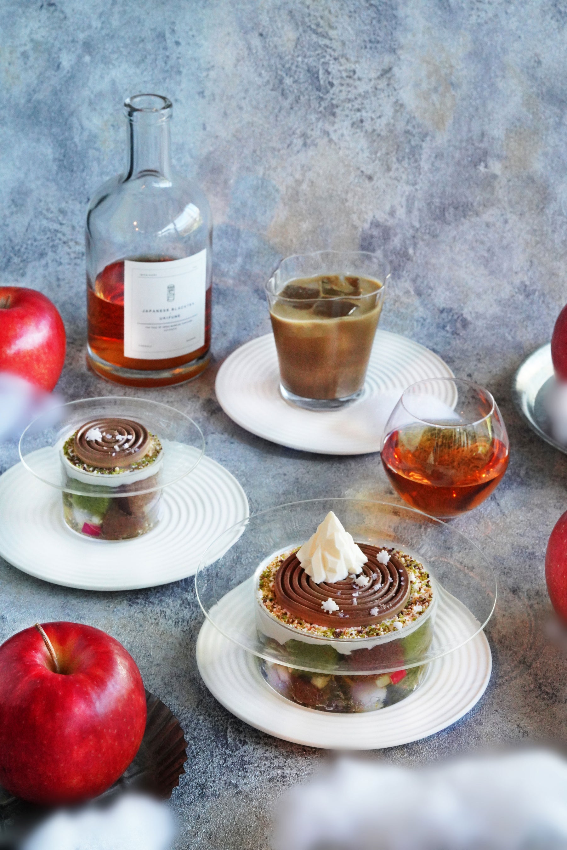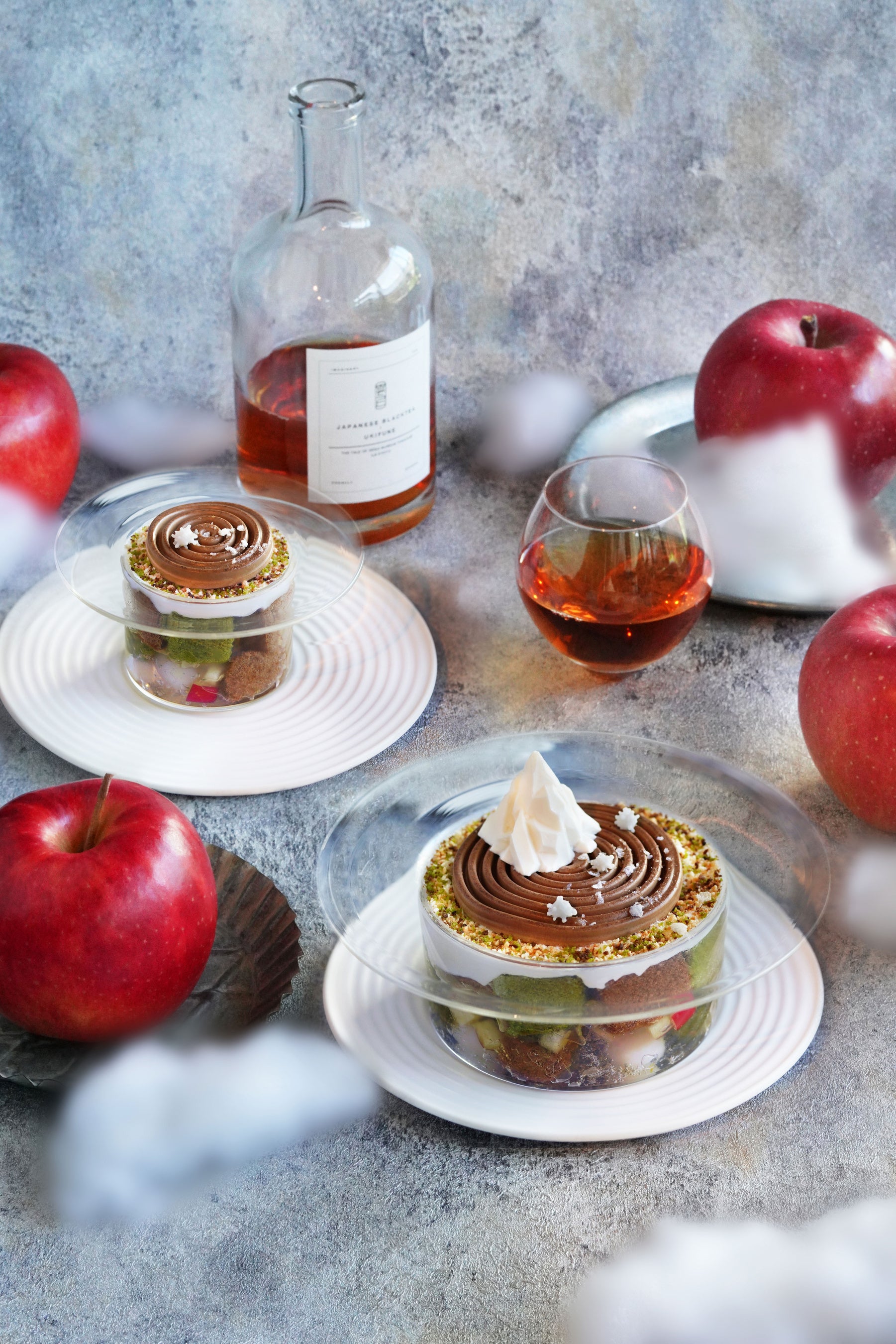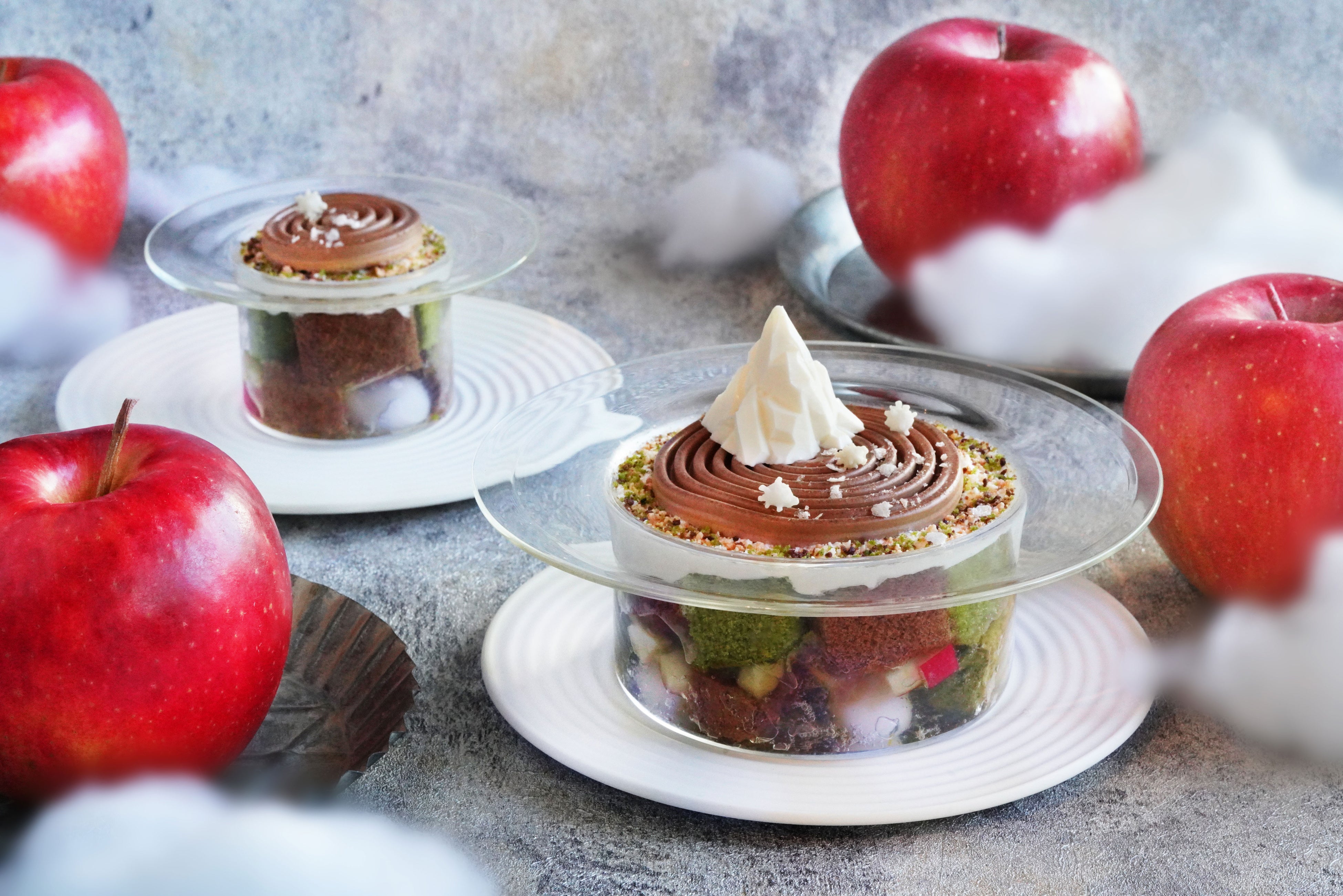 冬の寒さが深まる中、京都宇治『雲上茶寮』に冬季限定スイーツが登場しました。冬の季節にぴったりな、甘い林檎と和紅茶を使ったこのパフェは、フレッシュでシャキッとした林檎の食感と和紅茶の豊かな香りが調和する、冬ならではの贅沢な味わい。パフェのデザインは、洲浜をモチーフとしたムース上に雪山と霜柱が立った様子を表現しており、まるで冬の庭園を散歩しているかのような幻想的なスイーツです。見ても食べても楽しめる贅沢スイーツをぜひご賞味ください。