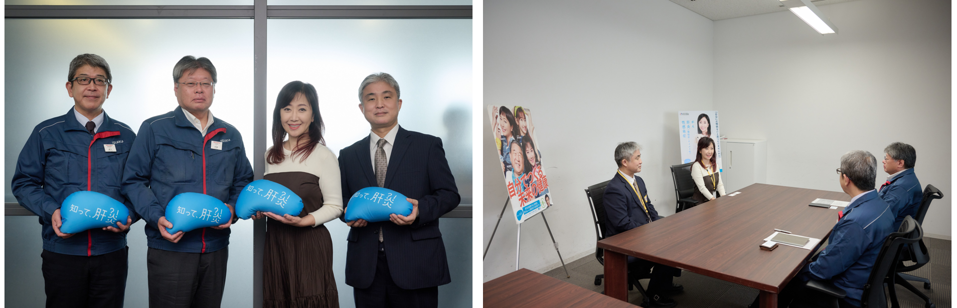 この度11月29日(水)に、「知って、肝炎プロジェクト」肝炎対策特別大使を務める伍代夏子氏が自動車メーカーいすゞ自動車株式会社の藤沢工場を訪問し、“ウイルス性肝炎”をテーマに、役員との対談や、従業員の皆さんに向けたトークイベントを実施しました。